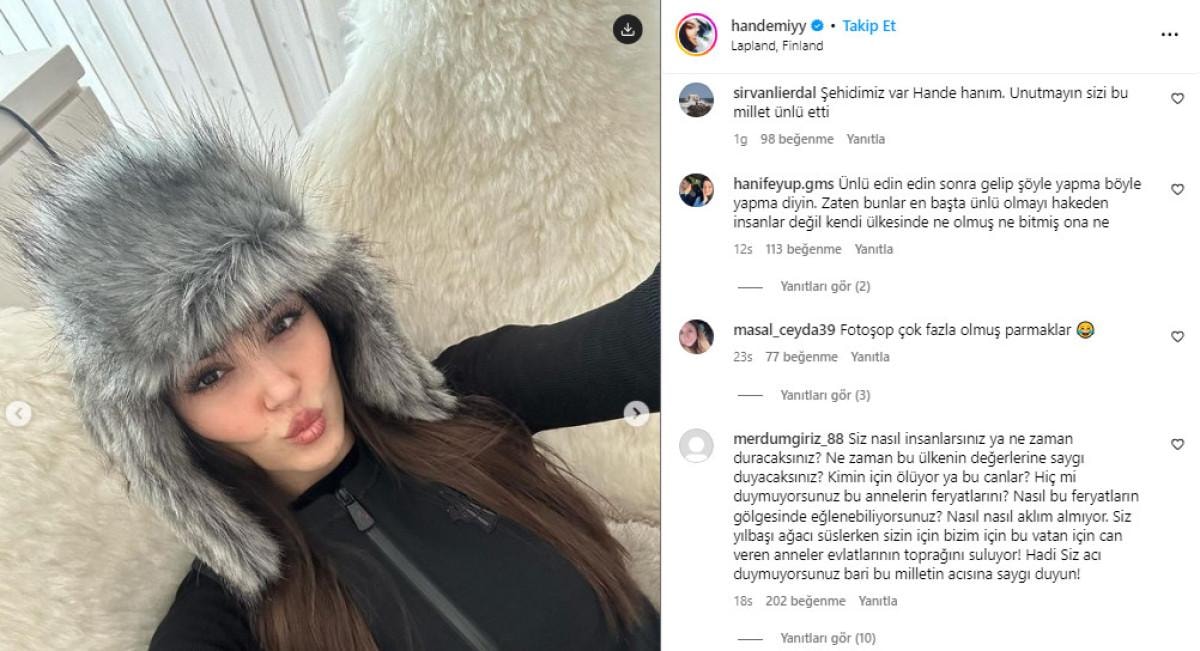 2 günde 12 askerimiz şehit olurken oyuncu Hande Erçel'in tatilinden kareler yayınlaması bir de üzerine yılbaşı kutlaması yapması takipçilerin tepkisini çekti.