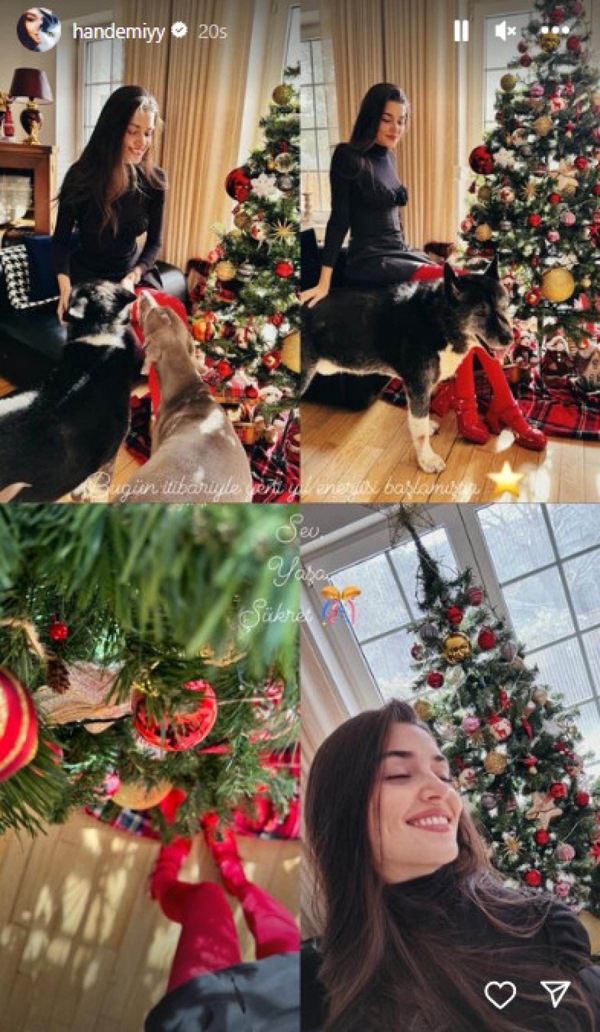 Erçel, daha sonra da yılbaşı ağacının önünde pozlar vererek "Bugün itibariyle yeni yıl enerjisi başlamıştır. Sev, yaşa, şükret." ifadelerini kullandı.