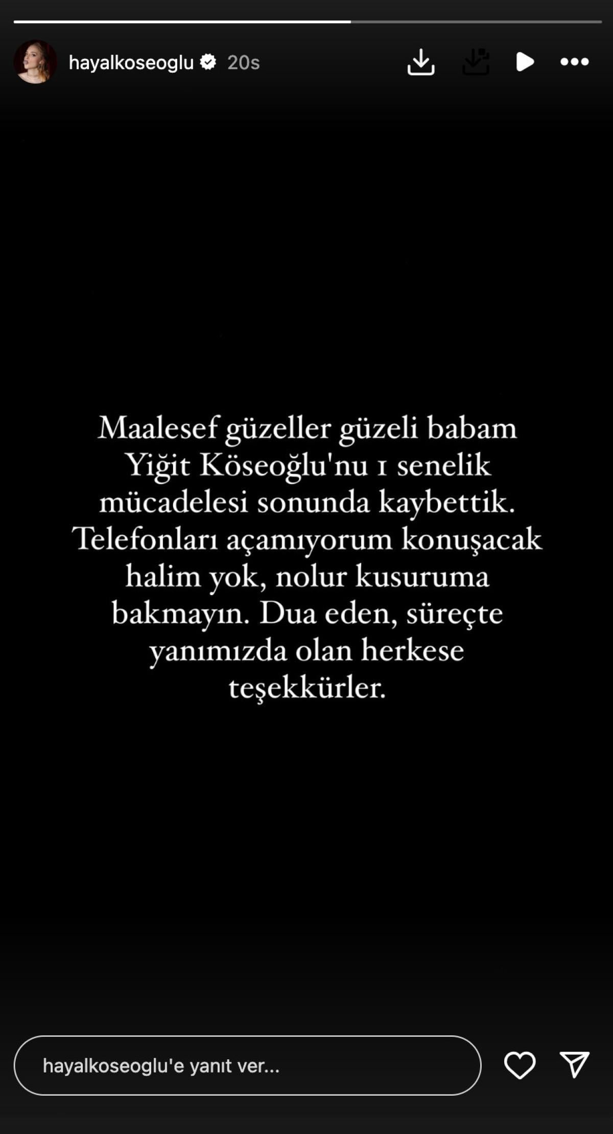 “Maalesef güzeller güzeli babam Yiğit Köseoğlu’nu 1 senelik mücadelesi sonunda kaybettik. Telefonları açamıyorum konuşacak halim yok, ne olur kusuruma bakmayın. Dua eden, süreçte yanımızda olan herkese teşekkürler.”