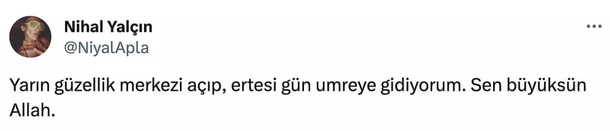 Ünlü oyuncu "Yarın güzellik merkezi açıp, ertesi gün Umre'ye gidiyorum. Sen büyüksün Allah" yazdı.
