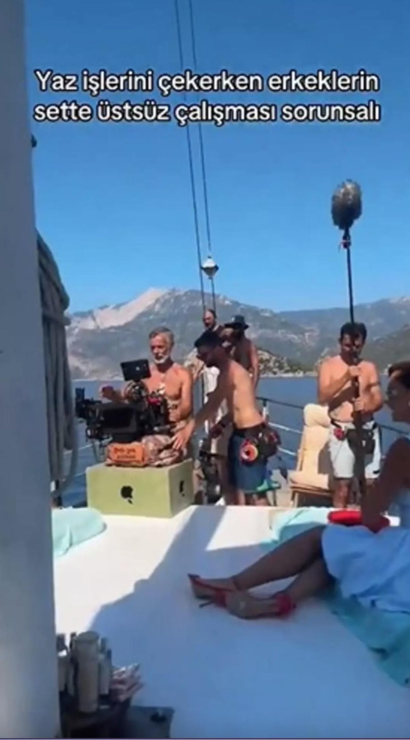 Ünlü isim paylaşımına; 'Yaz işlerini çekerken erkeklerin sette üstsüz çalışması sorunsalı' ifadelerini not düştü.