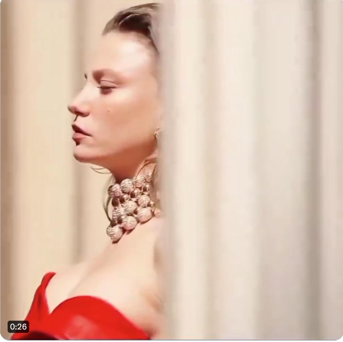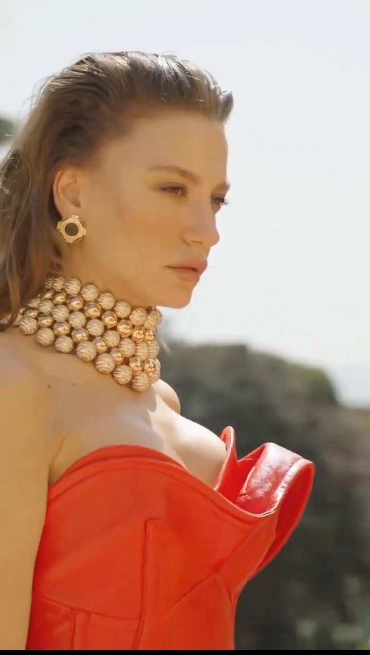 Kırmızı elbisesini büyük kolyesi ve büyük küpeleri ile kombinleyen Serenay Sarıkaya'yı görenler hayran kaldı.