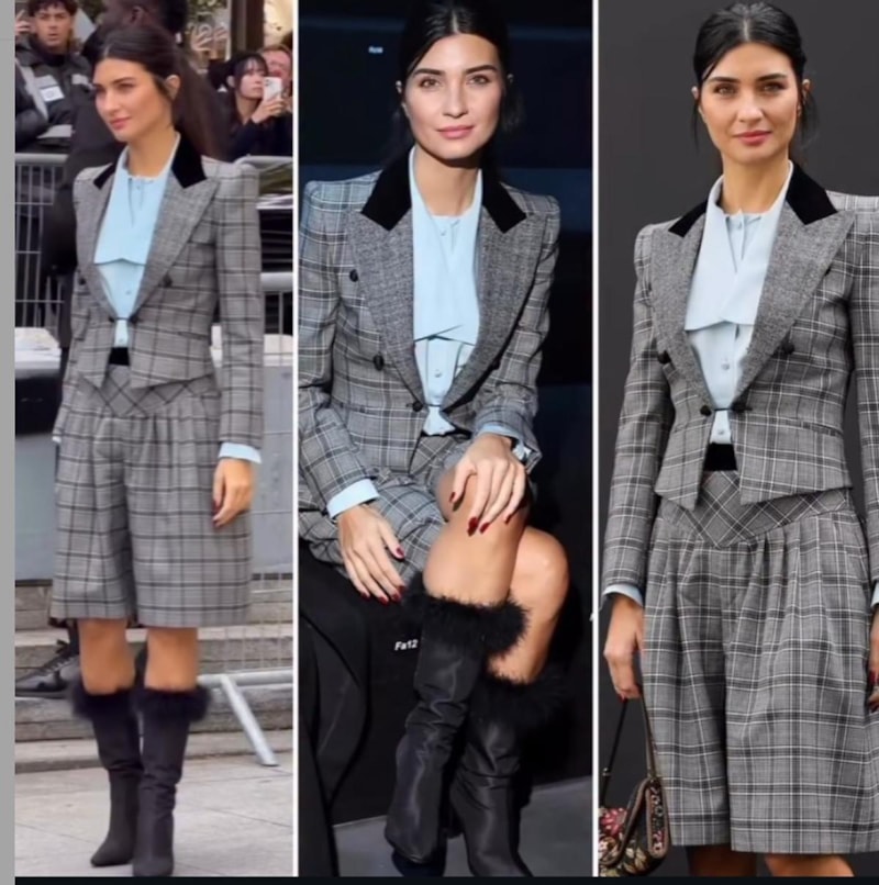 Paris Moda Haftası'nda dikkatleri üzerine çeken ünlü oyuncu, tıpkı şarkıcı Edis gibi Valentino SS26 defilesini izledi. İlk başta her şey tamamdı, Tuba'nın etekli ekoseli takımı ilk görüşte beğenildi.