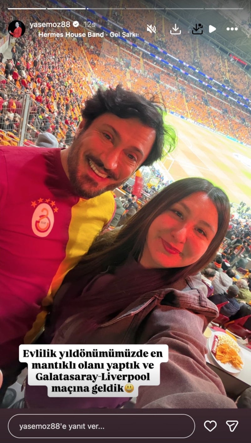 Sakallıoğlu paylaşımının altına ise, "Evlilik yıl dönümümüzde en mantıklı olanı yaptık ve Galatasaray-Liverpool maçına geldik." ifadelerini kullanarak takipçilerini yine güldürdü.