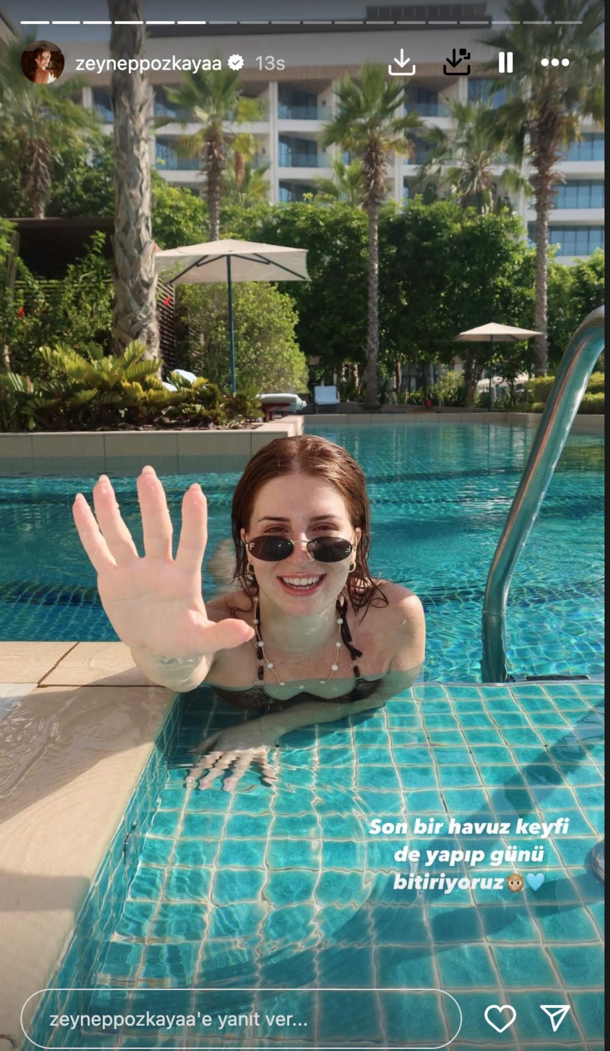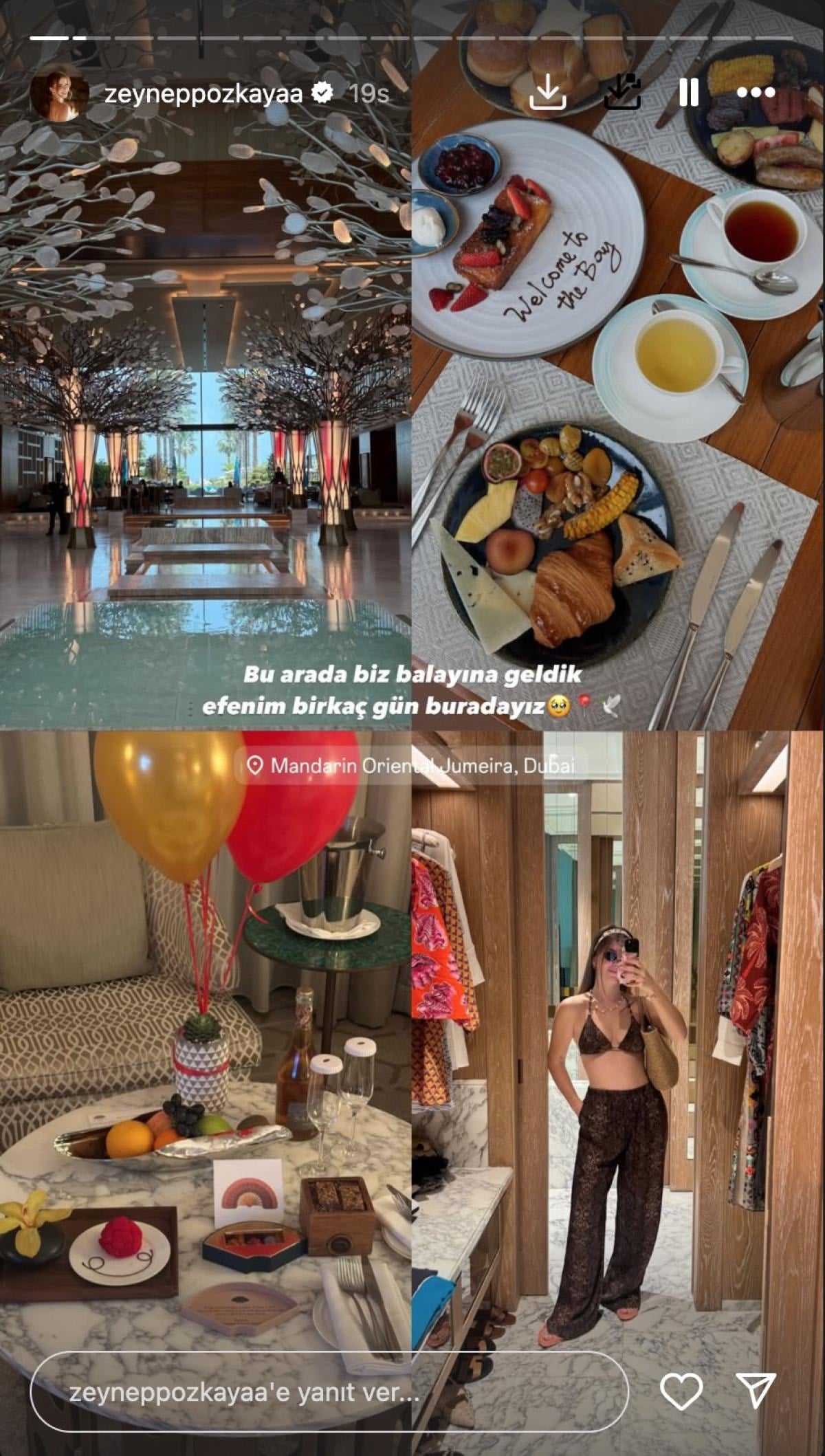 Genç çift düğün sonrası balayı için soluğu Dubai'de aldı. Özkaya, tatil pozlarını Instagram'dan yayımladı. Dubai'ye giden ikiliden oyuncu, balayı pozlarını "Bu arada biz balayına geldik. Birkaç gün buradayız" notuyla sevenlerinin beğenisine sundu.