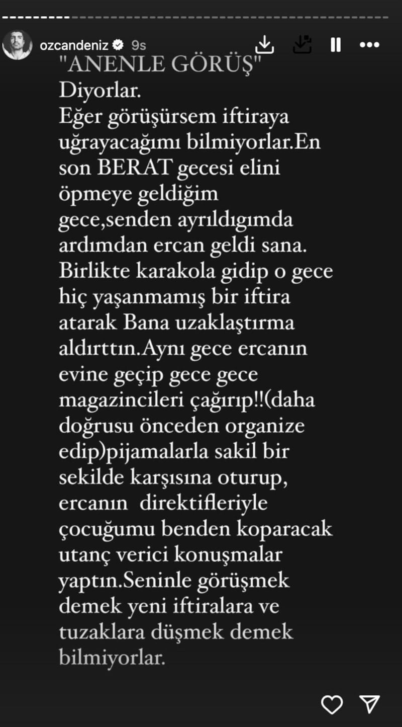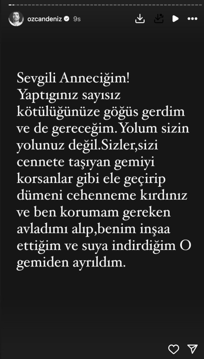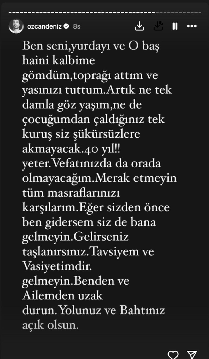 Ailesinden gelen barış çağrısını duymazdan gelen ünlü isim, “Sevgili anneciğim, yaptığınız sayısız kötülüğe göğüs gerdim ama yolumuz aynı değil.” diyerek ağır sözler sarf etti. Ailesinin kendisine ihanet ettiğini belirten sanatçı, “Vefatınızda da orada olmayacağım, masraflarınızı karşılarım merak etmeyin. Eğer sizden önce ben gidersem gelmeyin, gelirseniz taşlanırsınız. Tavsiyem ve vasiyetimdir. Gelmeyin, benden ve ailemden uzak durun. Yolunuz ve bahtınız açık olsun.” ifadeleriyle adeta nokta koydu.