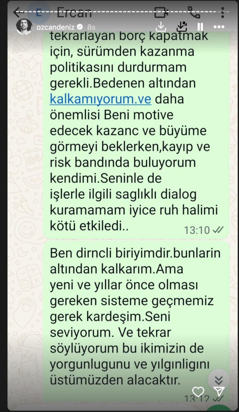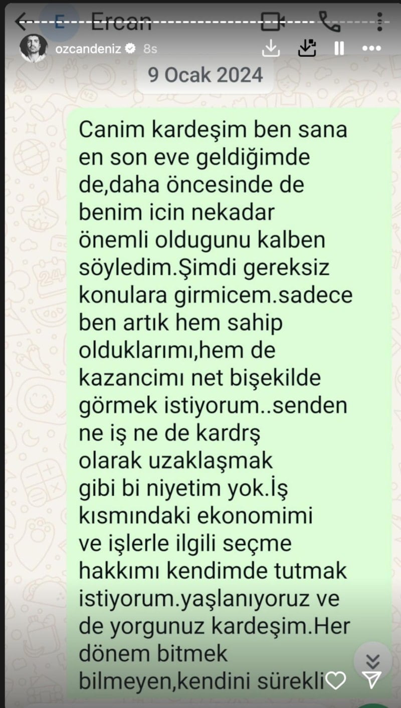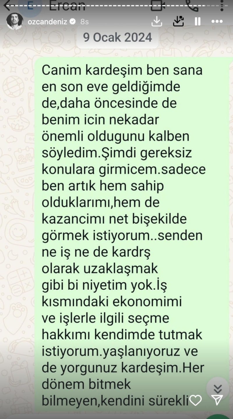 53 yaşındaki Özcan Deniz, bir dönem menajerliğini de yapan ağabeyi Ercan Deniz ile maddi konularda bazı anlaşmazlıklar yaşamıştı. Peş peşe imalı mesajlar yayınlayan ünlü şarkıcı, artık tek ailesinin oğlu Kuzey ve eşi Samar Dadgar olduğunu söylemişti.