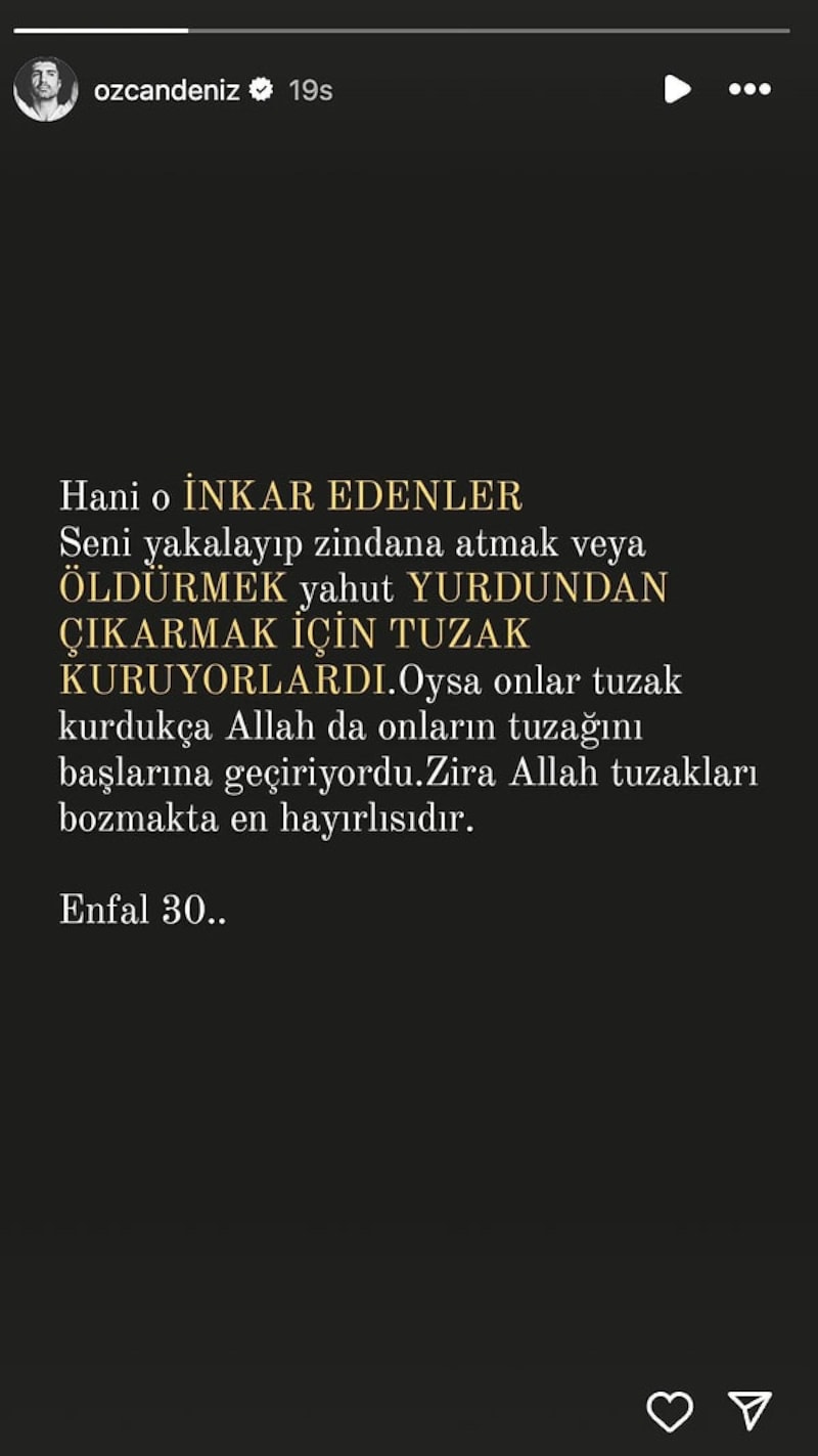 Özcan Deniz de Instagram hesabından Enfal Suresi'nin 30. ayetinden bir kısmını paylaşarak annesine yanıt verdi: