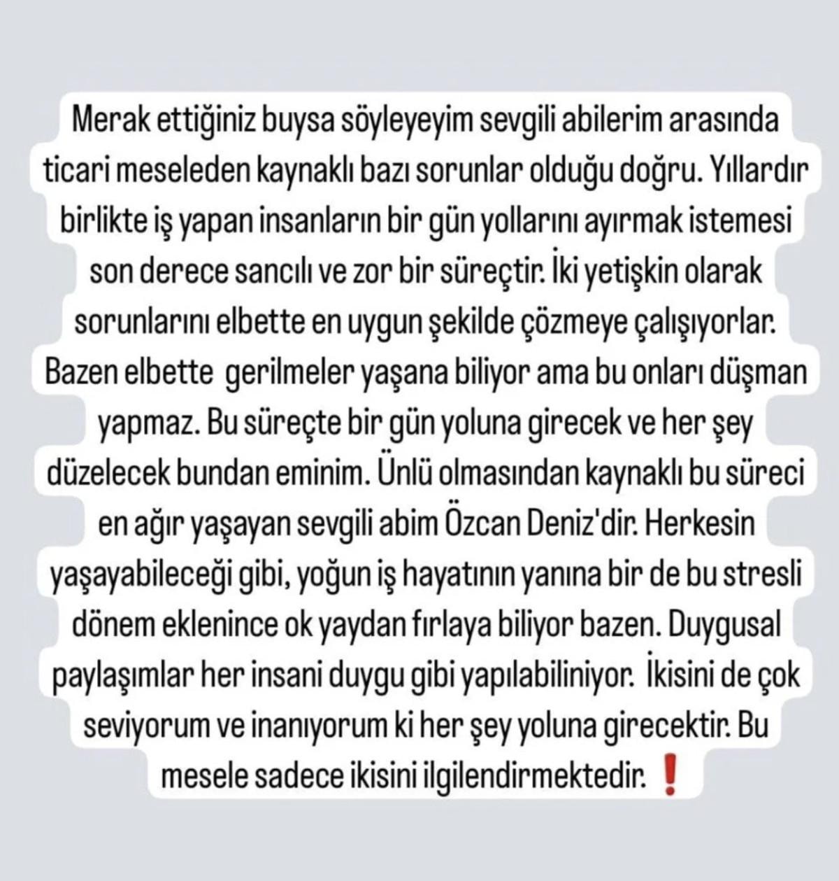 Ünlü olmasından kaynaklı bu süreci en ağır yaşayan sevgili abim Özcan Deniz'dir. Herkesin yaşayabileceği gibi, yoğun iş hayatının yanına bir de bu stresli dönem eklenince ok yaydan fırlayabiliyor bazen. Duygusal paylaşımlar her insani duygu gibi yapılabiliniyor. İkisini de çok seviyorum ve inanıyorum ki her şey yoluna girecektir. Bu mesele sadece ikisini ilgilendirmektedir.