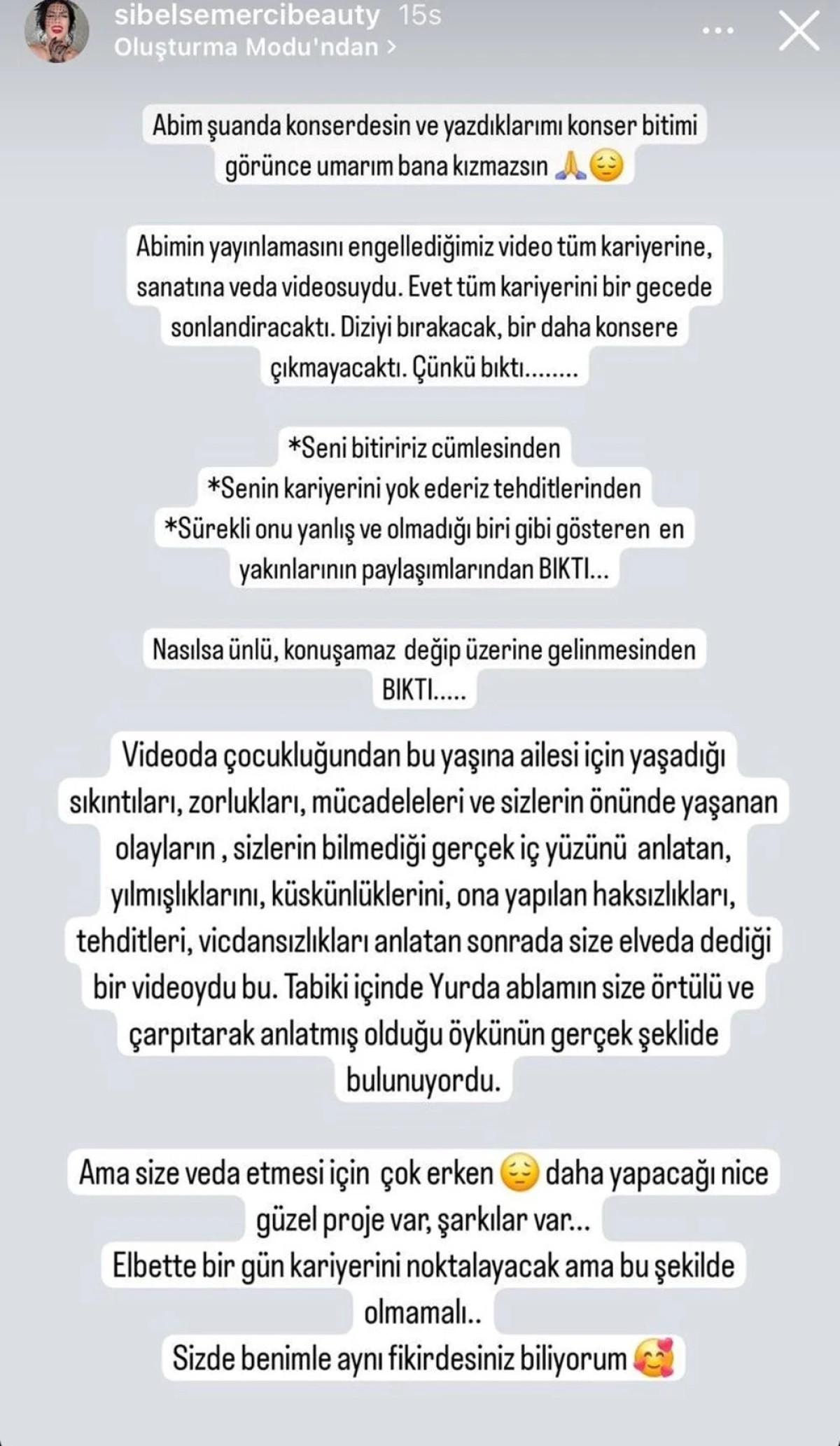 Semerci, "Abimin yayınlamasını engellediğimiz video tüm kariyerine, sanatına veda videosuydu. Evet tüm kariyerini bir gecede sonlandıracaktı. Diziyi bıracaktı, bir daha konsere çıkmayacaktı. Çünkü bıktı..." dedi.