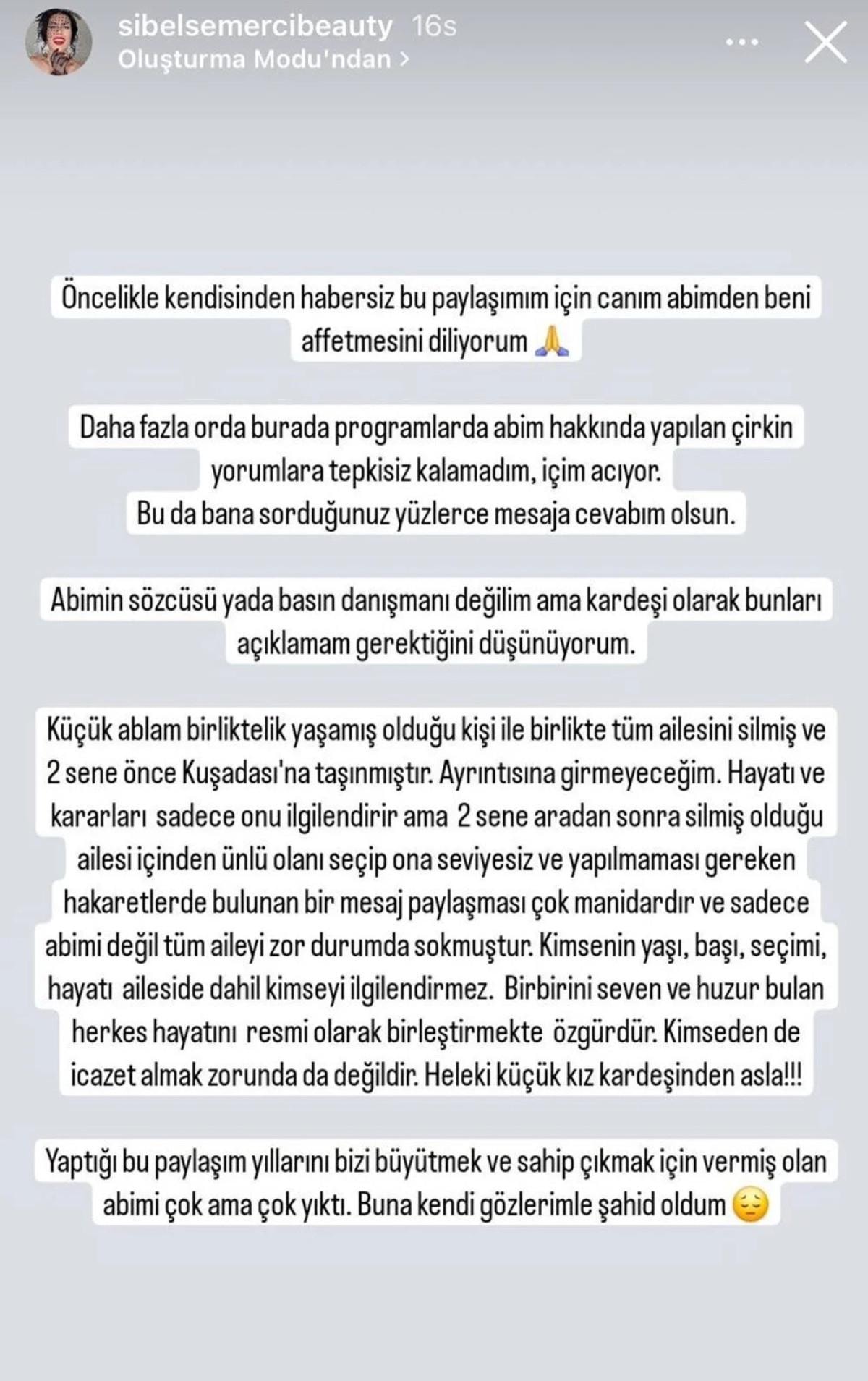 Bu kez Deniz'in küçük kız kardeşi Sibel Semerci, Instagram hesabından peş peşe açıklama yaptı. Semerci şu açıklamayı yaptı:
