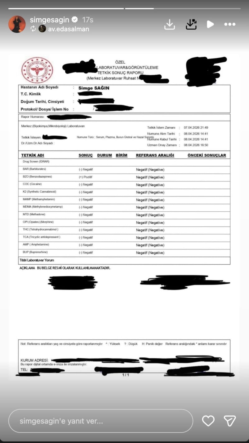 Simge Sağın, özel bir laboratuvarda ayrıca test yaptırdı. Sağın, uyuşturucu test sonucunu da sosyal medya üzerinden takipçileriyle paylaştı. Teste göre Simge Sağın'ın tüm uyuşturucu testleri negatif çıktı.