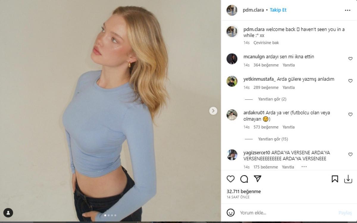 Arda Güler'in bir zamanlar takipleştiği Pdm Clara, Arda Güler'in transferi sonrası Instagram hesabından kendi fotoğrafını yayınlayıp ''Tekrardan hoş geldin. Seni Uzun zamandır görmedim." şeklinde bir paylaşımda bulundu.