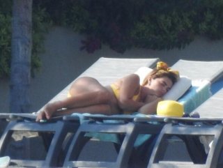 Sarı bikinisini aynı renkteki saç aksesuarıyla tamamlayan ünlü oyuncu, şezlongunda güneşlenirken uyuyakaldı. 2 çocuk annesi oyuncunun, fit hali dikkatlerden kaçmadı.