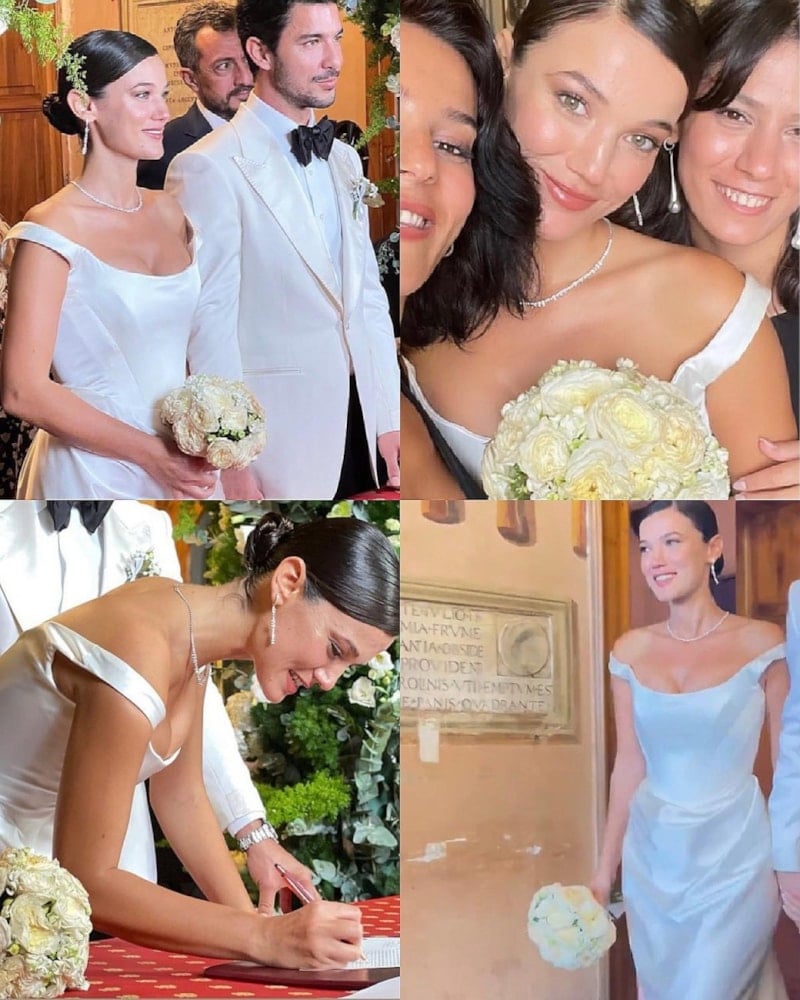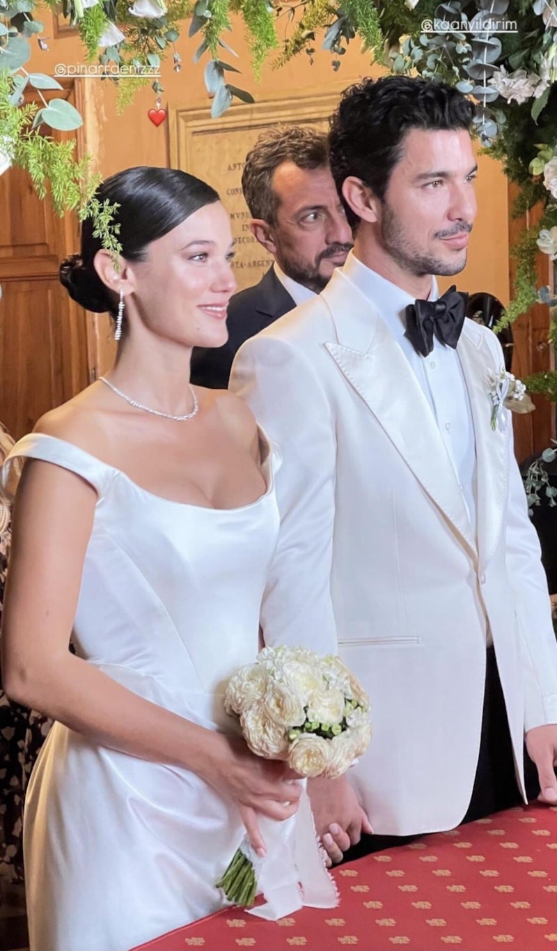 Pınar Deniz, Vivienne Westwood tasarımı bir gelinlik giyerken, Kaan Yıldırım beyaz ceketli bir takım giymeyi tercih etti.