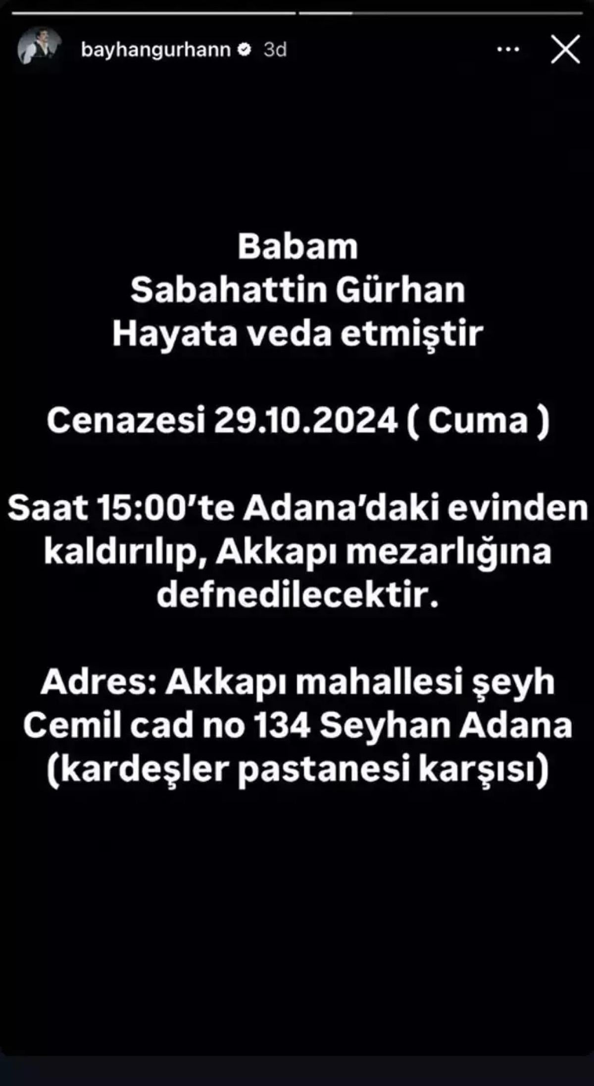 Bayhan, "Babam Sabahattin Gürhan hayata veda etmiştir. Cenazesi Cuma günü saat 15.00'te Adana'daki evinden kaldırılıp Akkapı mezarlığına defnedilecektir." dedi.