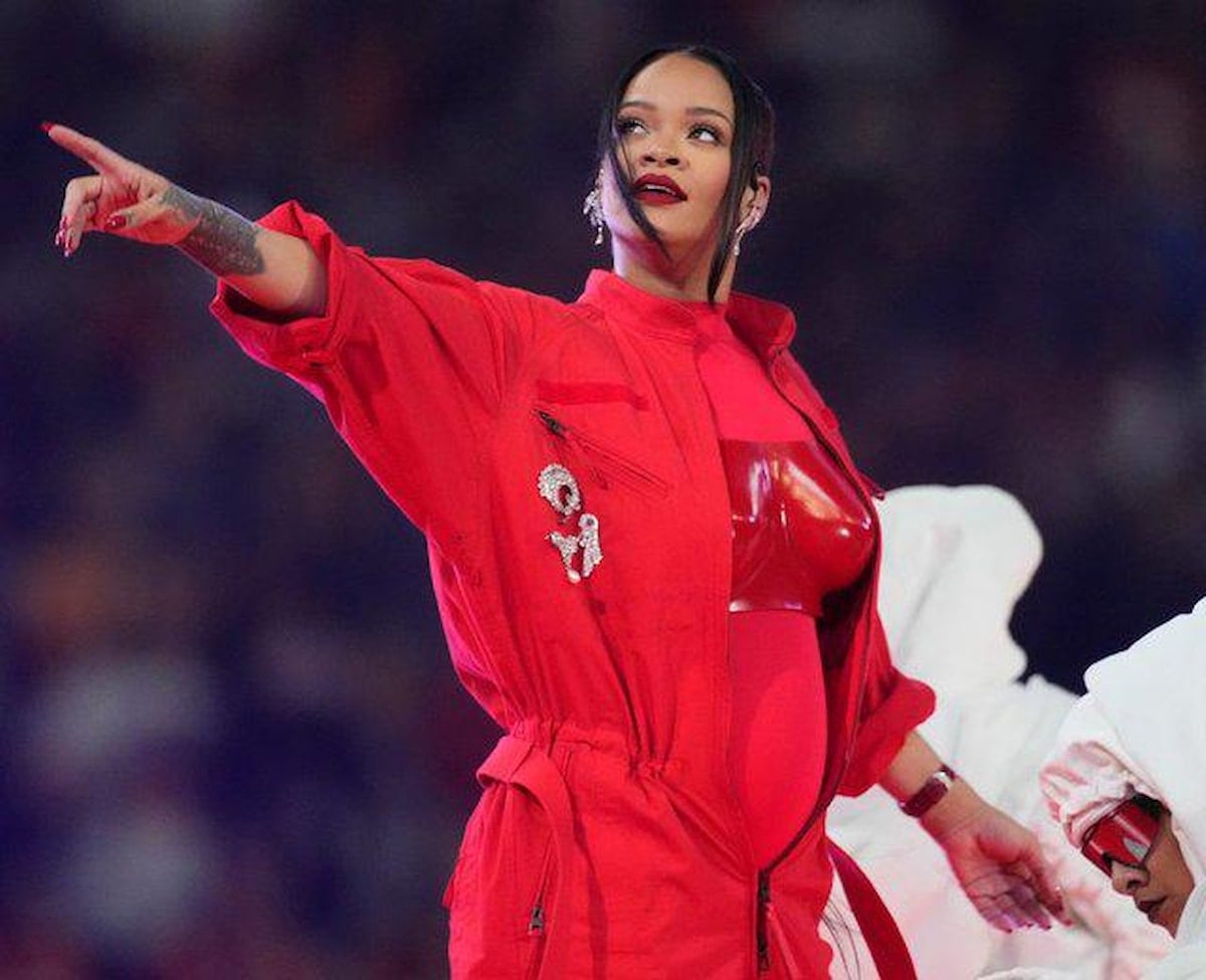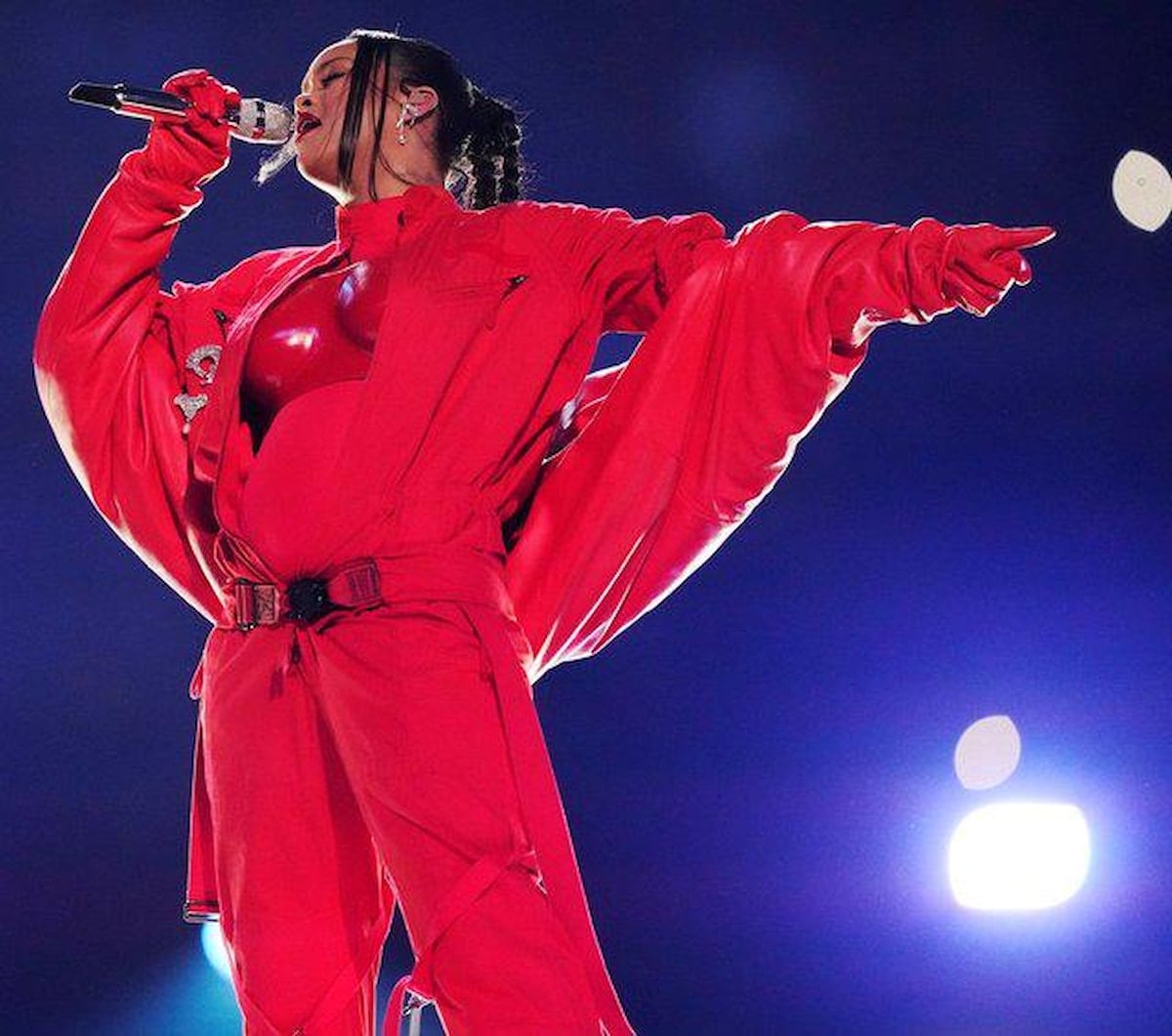 İlk çocuğunu dokuz ay önce dünyaya getiren Rihanna, Arizona'daki State Farm Stadyumu'ndaki 'Super Bowl' şovunda belirginleşen karnını sergiledi.