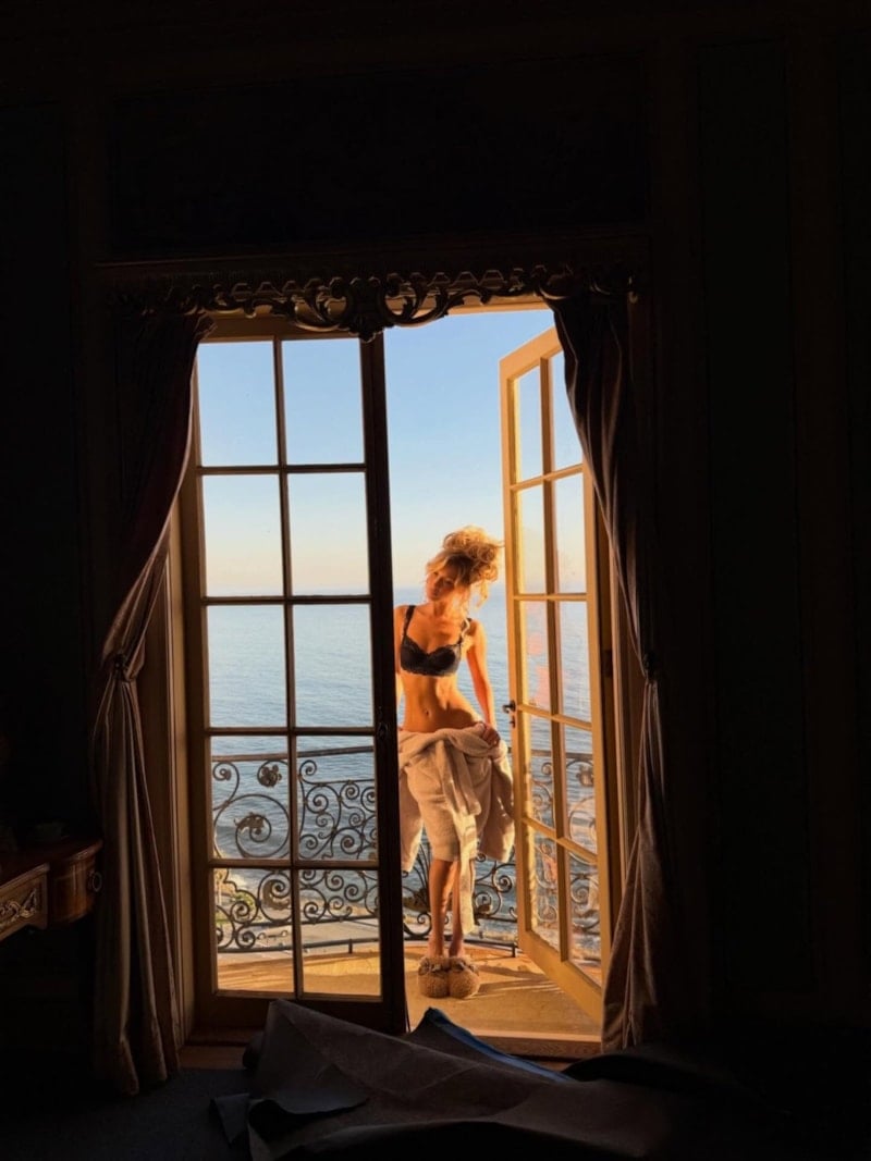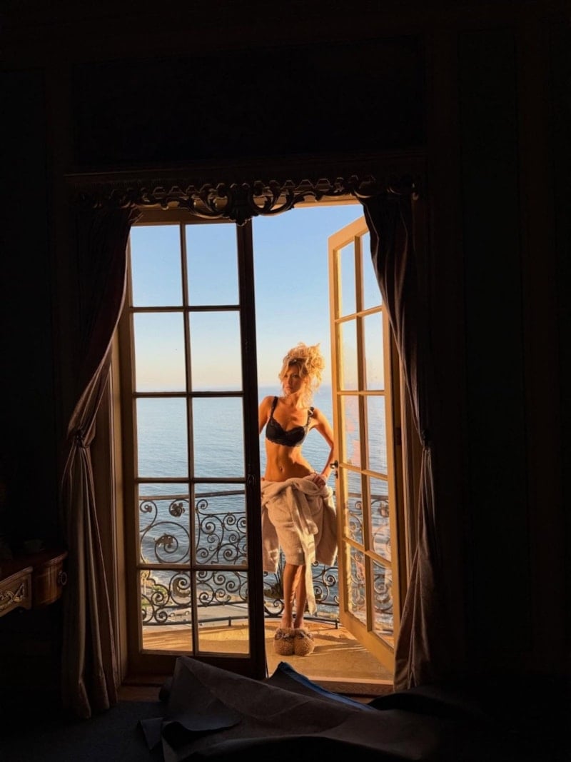 Fotoğrafların birinde süper model, manzaraya bakan bir balkonda poz verirken dantel bralette ile şekillendirilmiş karın kaslarını sergiliyor ve alt kısmına bir sabahlık sarıyor. Güneşin sıcak ışığı altında model, korkuluklara yaslanarak kareleri tamamlıyor.