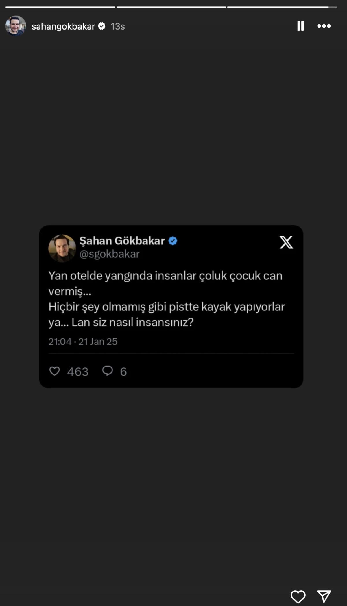 Şahan Gökbakar, yangın faciasının yaşandığı otele yakın bölgede kayak yapmaya devam edenlere sosyal medya hesabından sert bir tepki gösterdi.