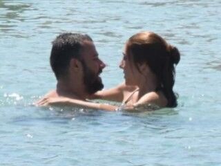 Sıcaktan bunaldıkları için uzun süre denizden çıkmayan Salih Bademci ve İmer Özgün’ün romantik anları, objektife yansıdı. İkili, görümtülendiklerini fark edince denizden çıkıp otellerine döndüler.