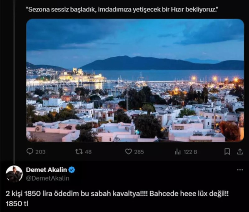 Instagram hesabından bu olayı yayınlayan Akalın, "İki kişi sabah kahvaltısı için 1850 lira ödedim! Hem de bahçede, lüks bir yer de değildi." yazdı.