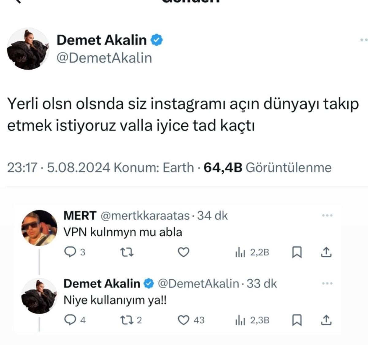 Günlerdir Instagram'a giremeyen ve VPN kullanmayı da reddeden Demet Akalın, isyanını X'ten dile getirdi.