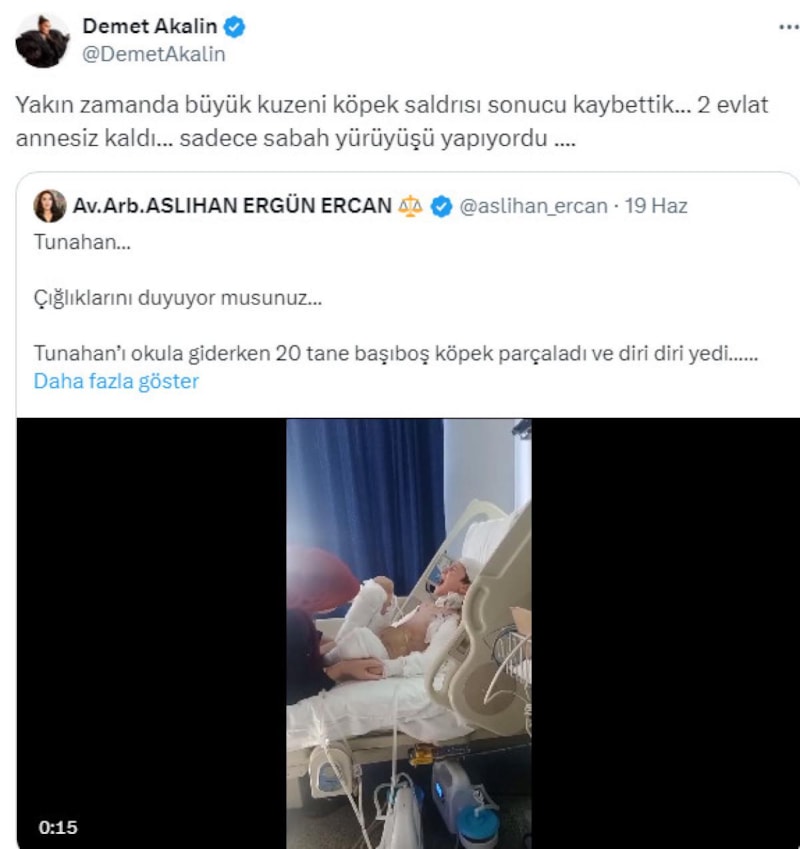 Akalın, sosyal medyada yaptığı paylaşımda; 'Yakın zamanda büyük kuzenim köpek saldırısı sonucu kaybettik... 2 evlat annesiz kaldı. Sadece sabah yürüyüşü yapıyordu...' ifadelerini kullandı.