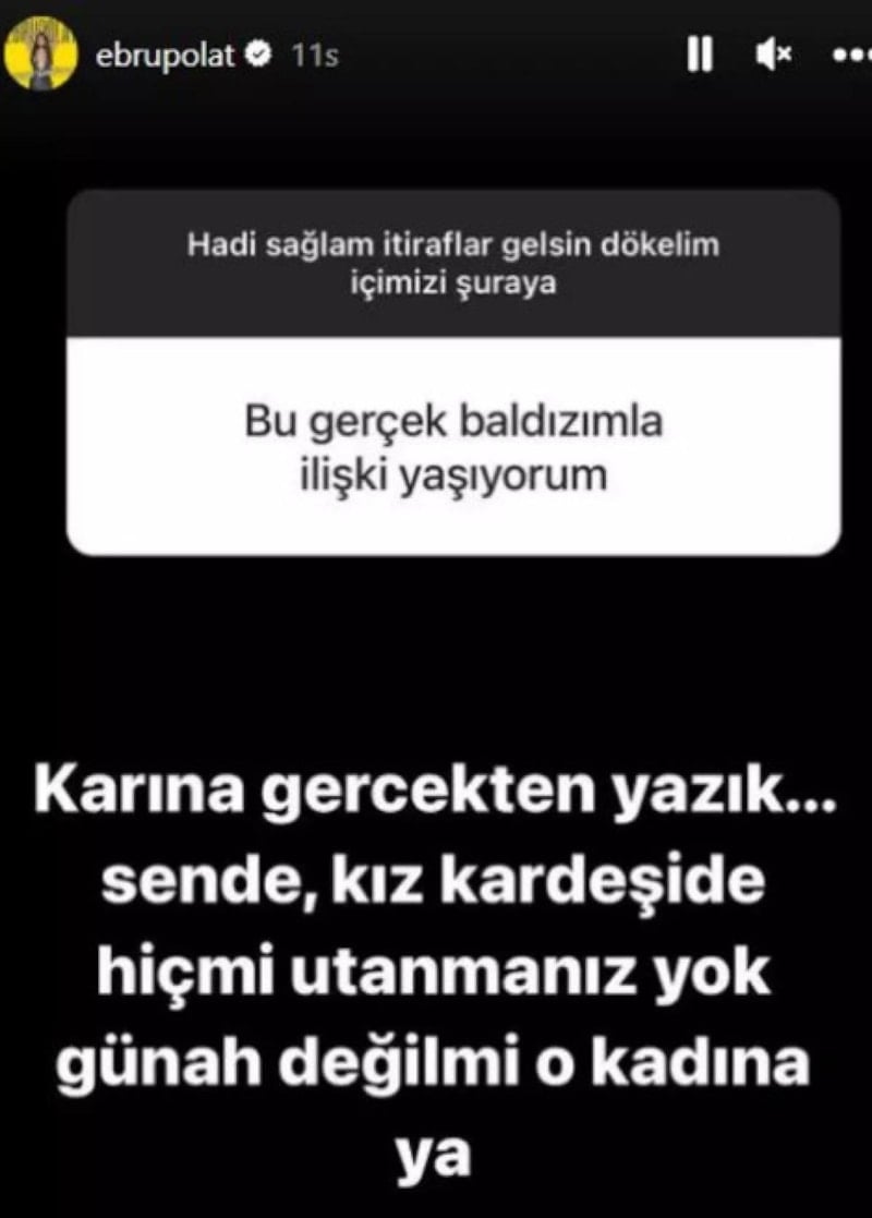 Bir başkası ise gerçek baldızıyla ilişki yaşadığını söyleyince Ebru Polat, "Karına gerçekten yazık, sen de kız kardeşi de hiç mi utanmanız yok?" diyerek takipçisini ayıpladı.