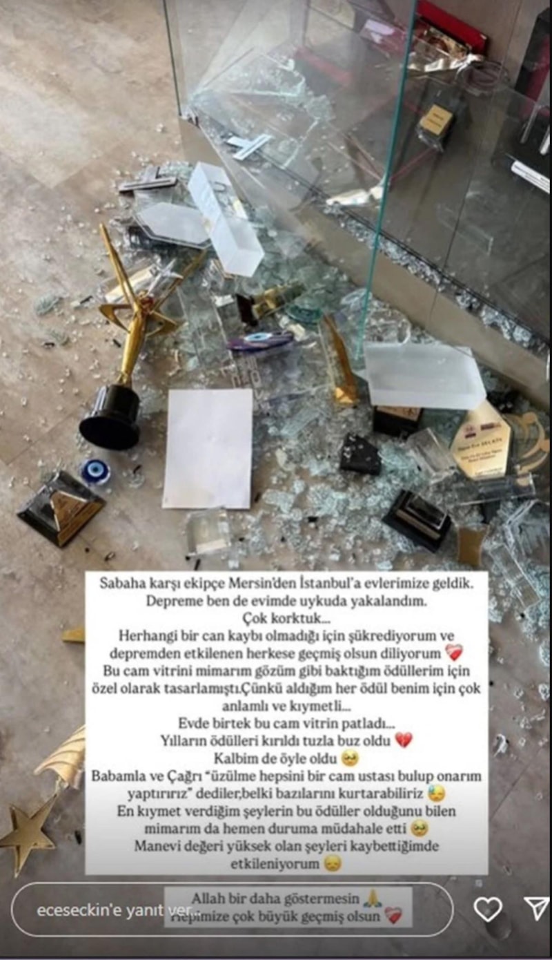 Depremlerin ardından şarkıcı Ece Seçkin, Instagram'da yaptığı paylaşımla adından söz ettirdi. Depreme evinde uykuda yakalan Seçkin, ödüllerinin tuzla buz olduğunu açıkladı: