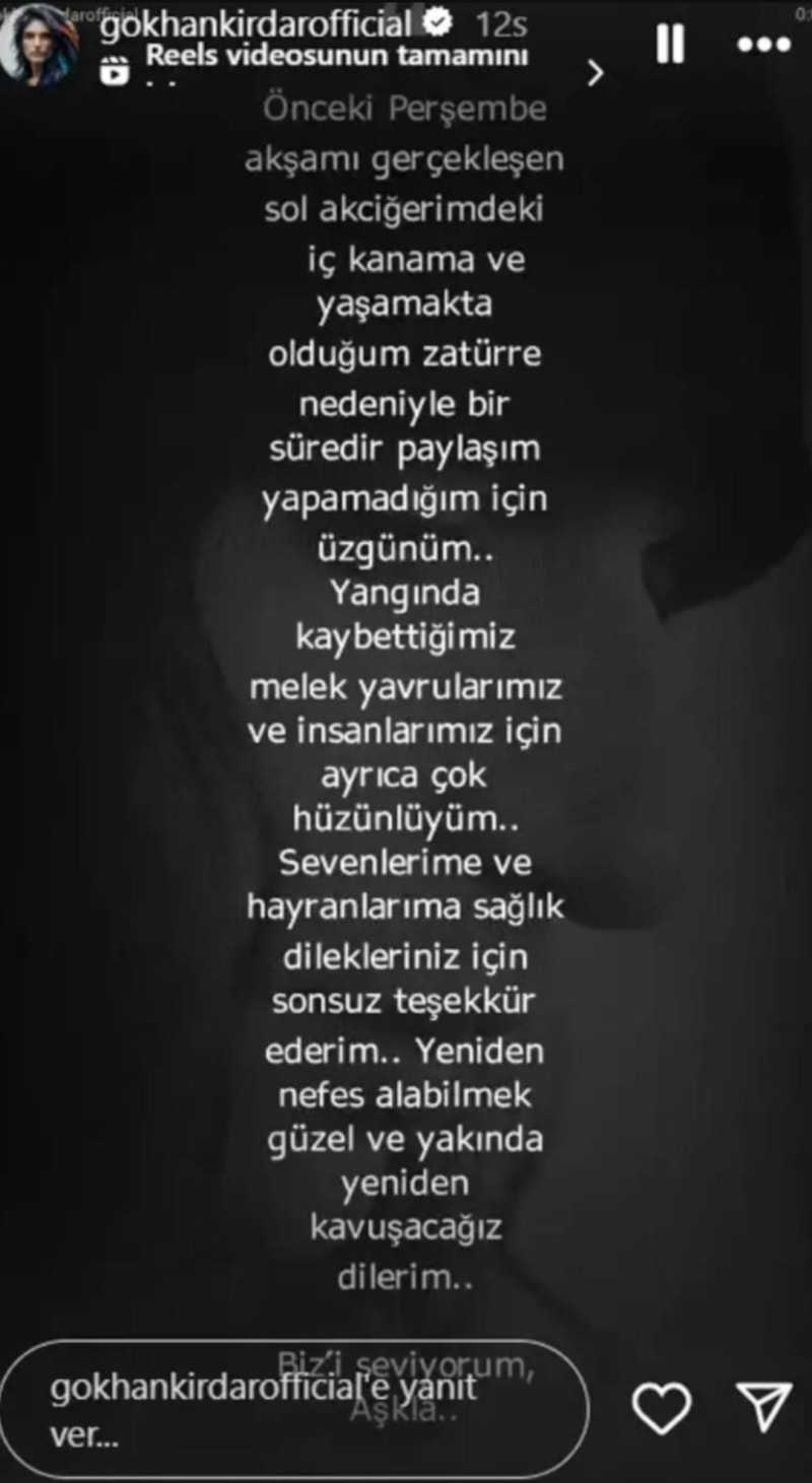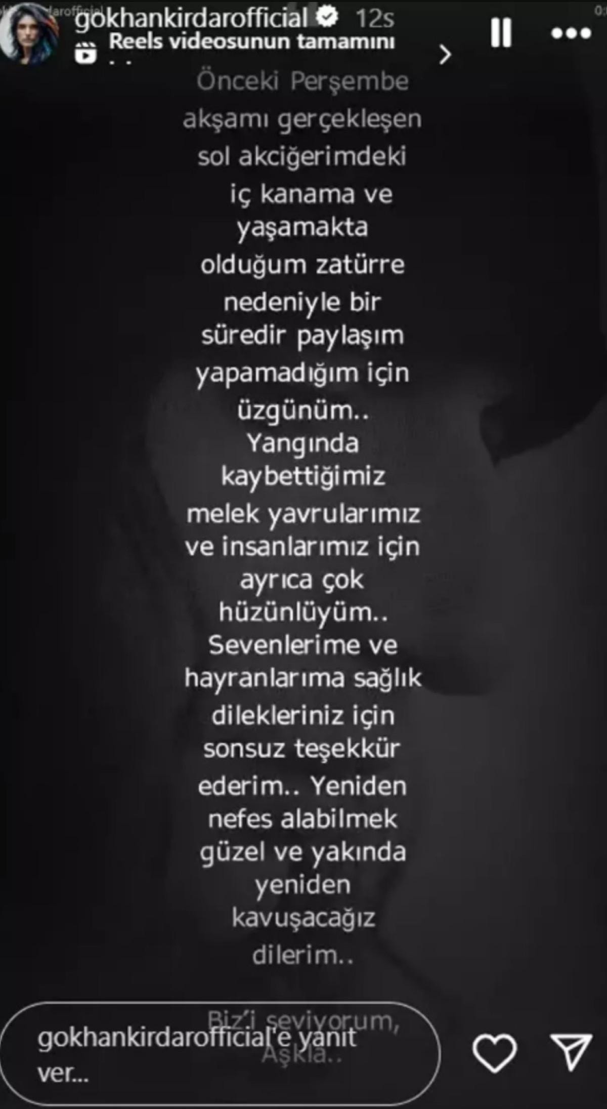 "Önceki Perşembe akşamı gerçekleşen sol akciğerimdeki iç kanama ve yaşamakta olduğum zatürre nedeniyle bir süredir paylaşım yapamadığım için üzgünüm…"