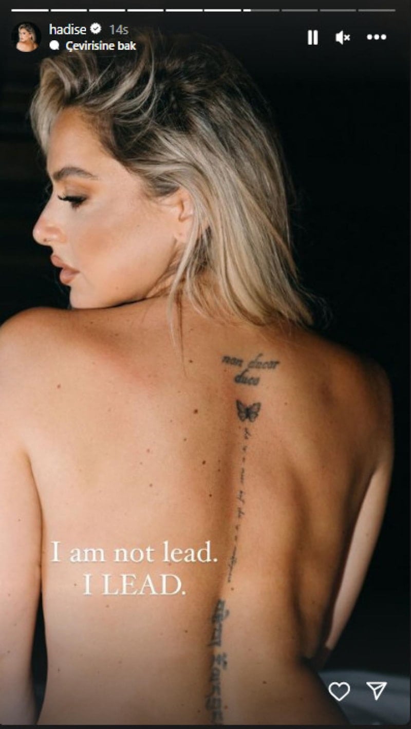Hadise'nin sırtındaki dövme dikkatleri üzerine çekti. Şarkıcı paylaşıma "Ben lider değilim, önderim" notunu düştü.