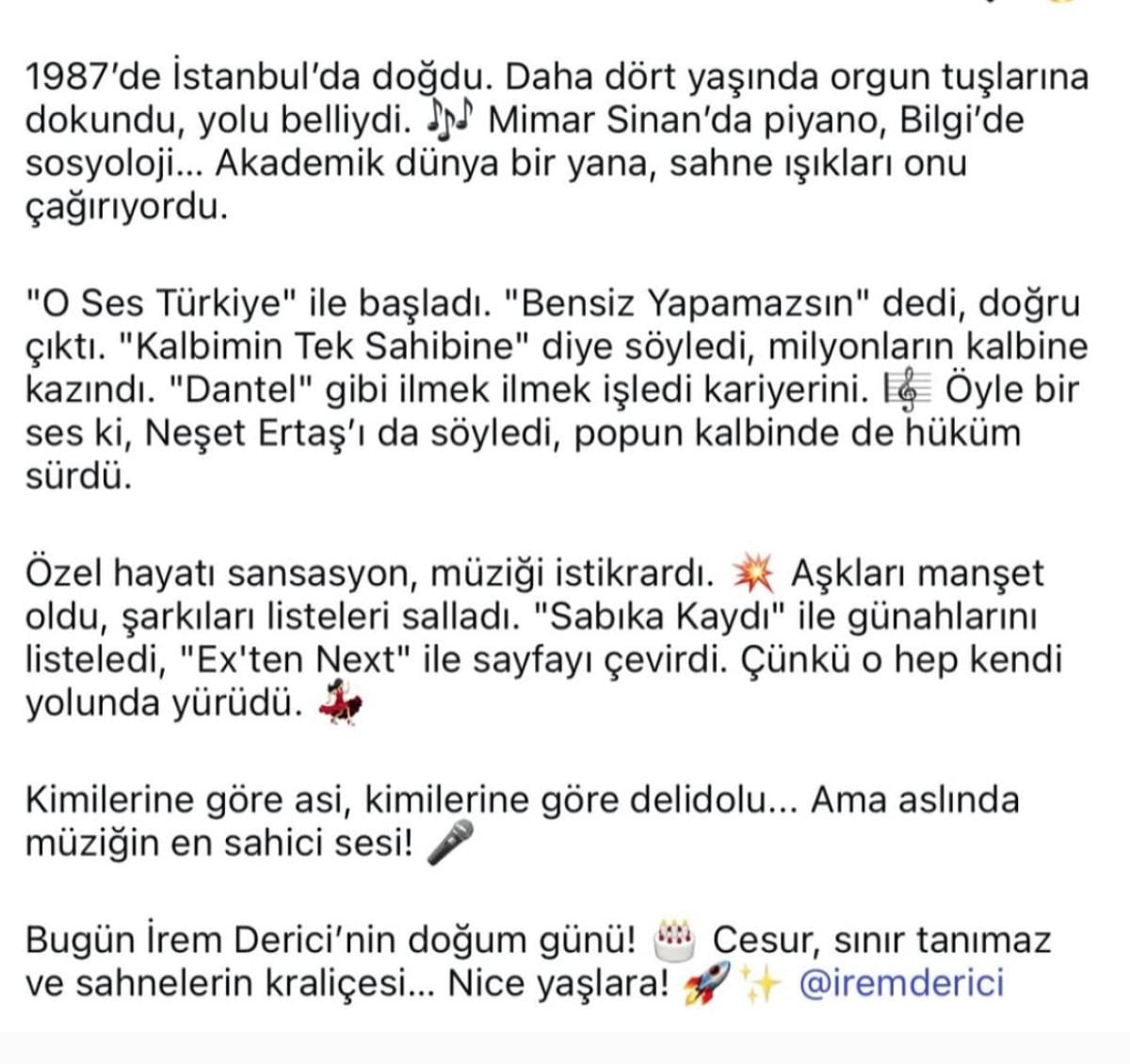Bugün İrem Derici'nin doğum günü! Cesur, sınır tanımaz ve sahnelerin kraliçesi... Nice yaşlara!"