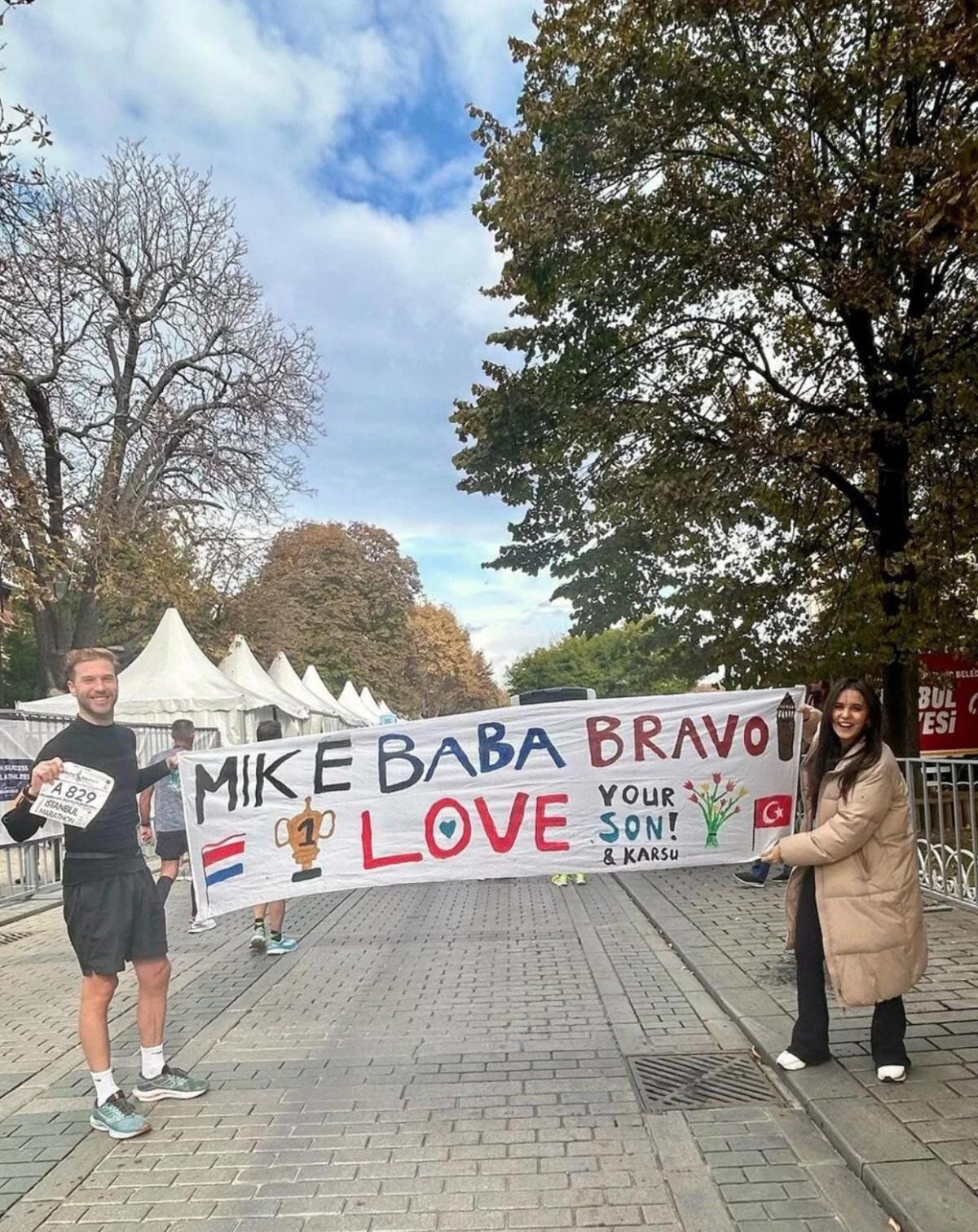 Karsu, koşuyu bitiren eşini "Mike baba tebrikler. Sevgiler oğlun ve Karsu" yazılı pankartla karşıladı.