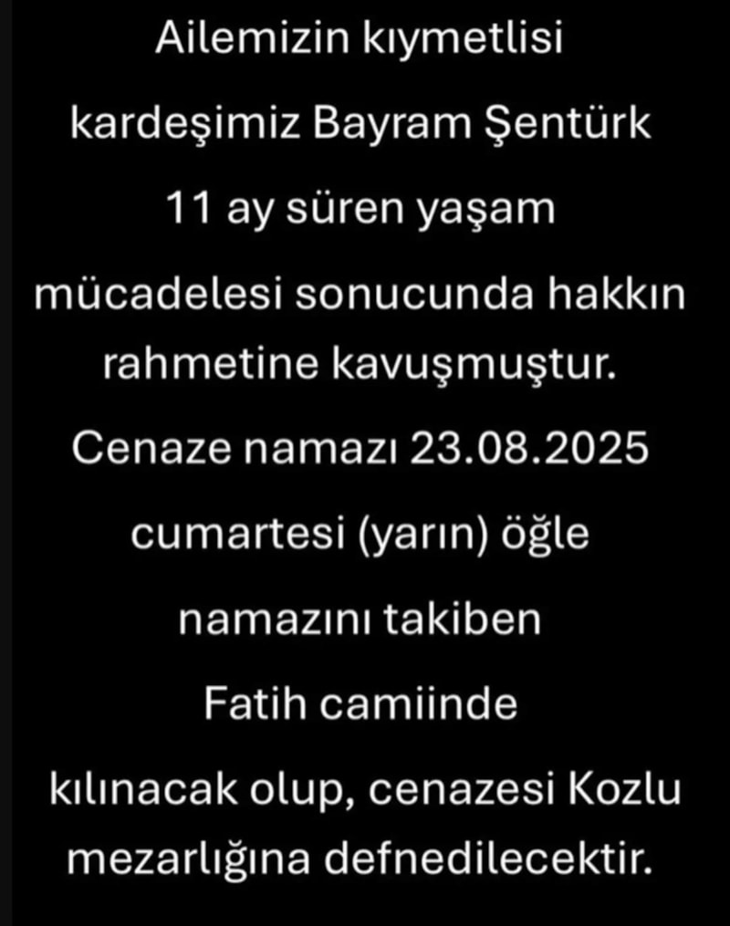 Metin Şentürk bugün yaptığı paylaşımla acı haberi paylaştı. Şentürk kardeşinin hayatını kaybettiği 'Ailemizin kıymetlisi kardeşimiz Bayram Şentürk 11 ay süren yaşam mücadelesi sonucunda hakkında rahmetine kavuşmuştur.