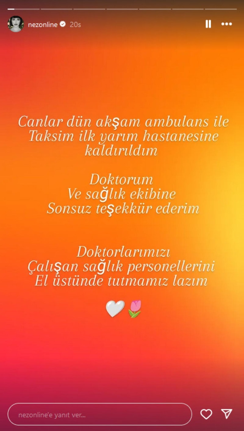 Oyuncu ve tiyatrocu Rüştü Onur Atilla ile yaşadığı ilişkiyi sonlandıran şarkıcı Nez, akşam saatlerinde yaşadığı rahatsızlık nedeniyle hastaneye kaldırıldı. Sosyal medya hesabından açıklama yapan Nez, iyi olduğunu duyurdu.