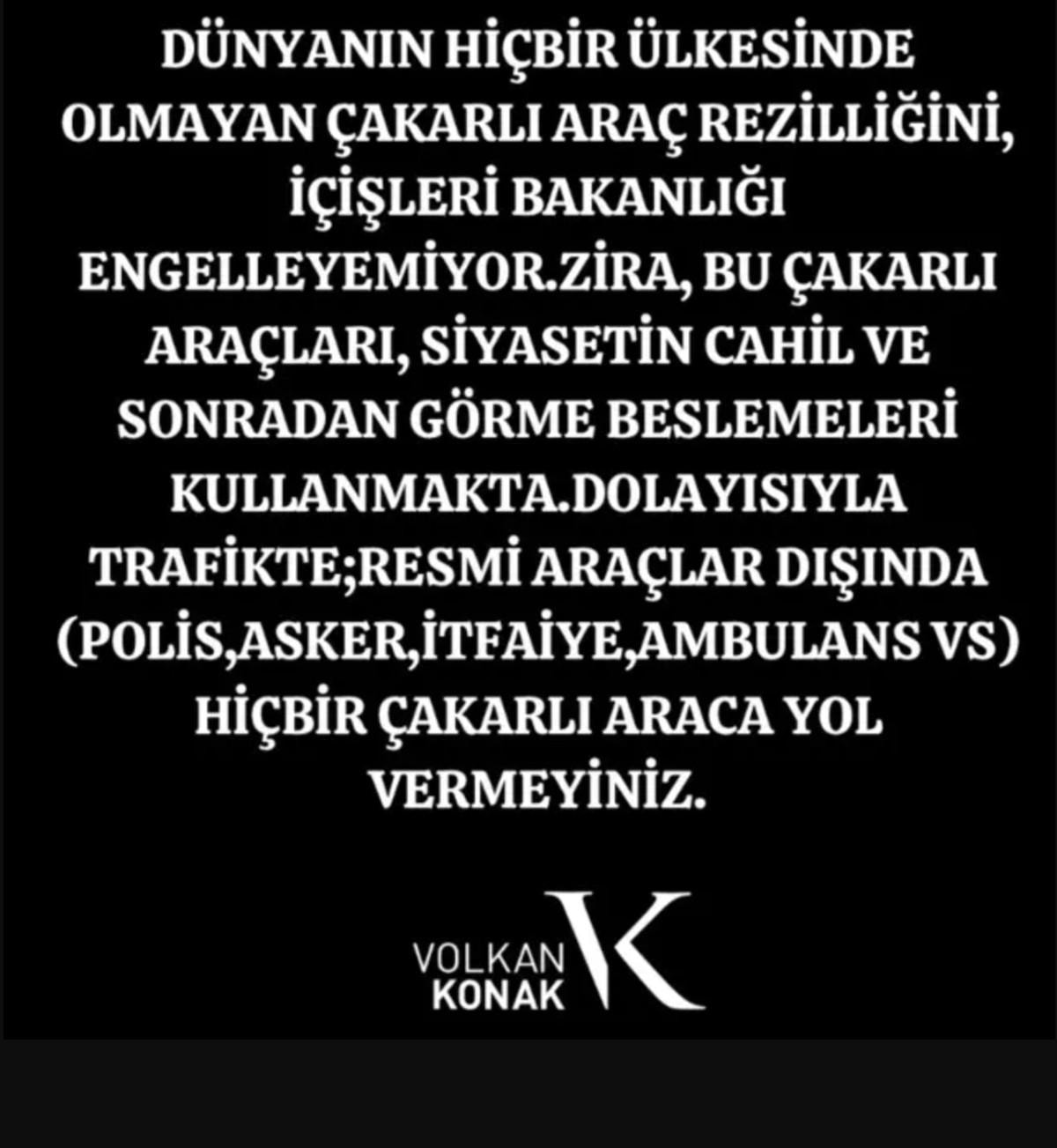 Zira, bu çakarlı araçları, siyasetin cahil ve sonradan görme beslemeleri kullanmakta. Dolayısıyla trafikte; resmi araçlar dışında (polis,asker,itfaiye,ambulans vs.) hiçbir çakarlı araca yol vermeyiniz.' sözleriyle dikkat çekti.
