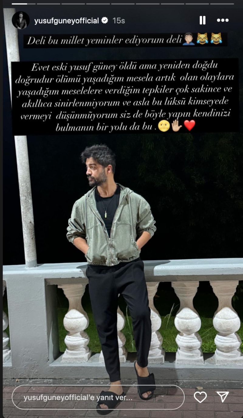 Yusuf Güney ayrıca sosyal medya hesabında "Eski Yusuf Güney öldü ama yeniden doğdu doğrudur ölümü yaşadığım mesela artık olan olaylara yaşadığım meselelere verdiğim tepkiler çok sakince" dedi.