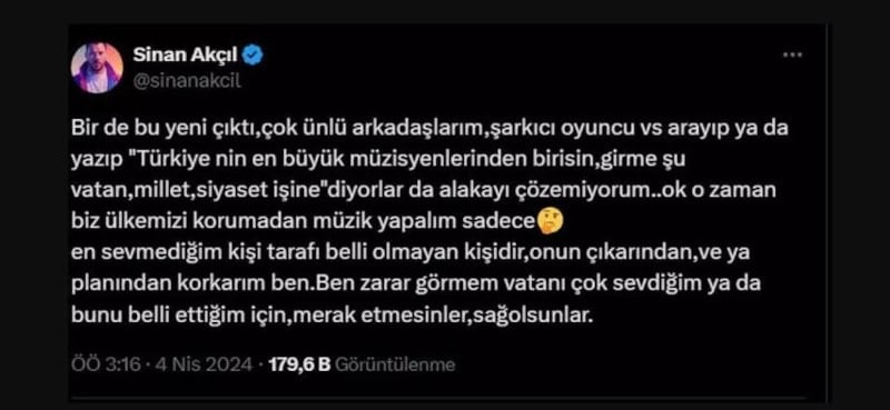 Ünlü şarkıcı Sinan Akçıl, Cumhur İttifakı İBB Başkan adayı Murat Kurum için seçim şarkısı bestelemiş ve sürekli destek paylaşımları yapmıştı. Akçıl, kendisini eleştirenlere sosyal medya hesabından seslendi.