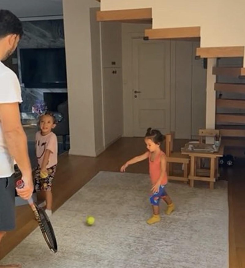 Ünlü oyuncu, eşi Ali Erel ve iki kızının evde tenis oynadığı anları takipçileriyle paylaştı.