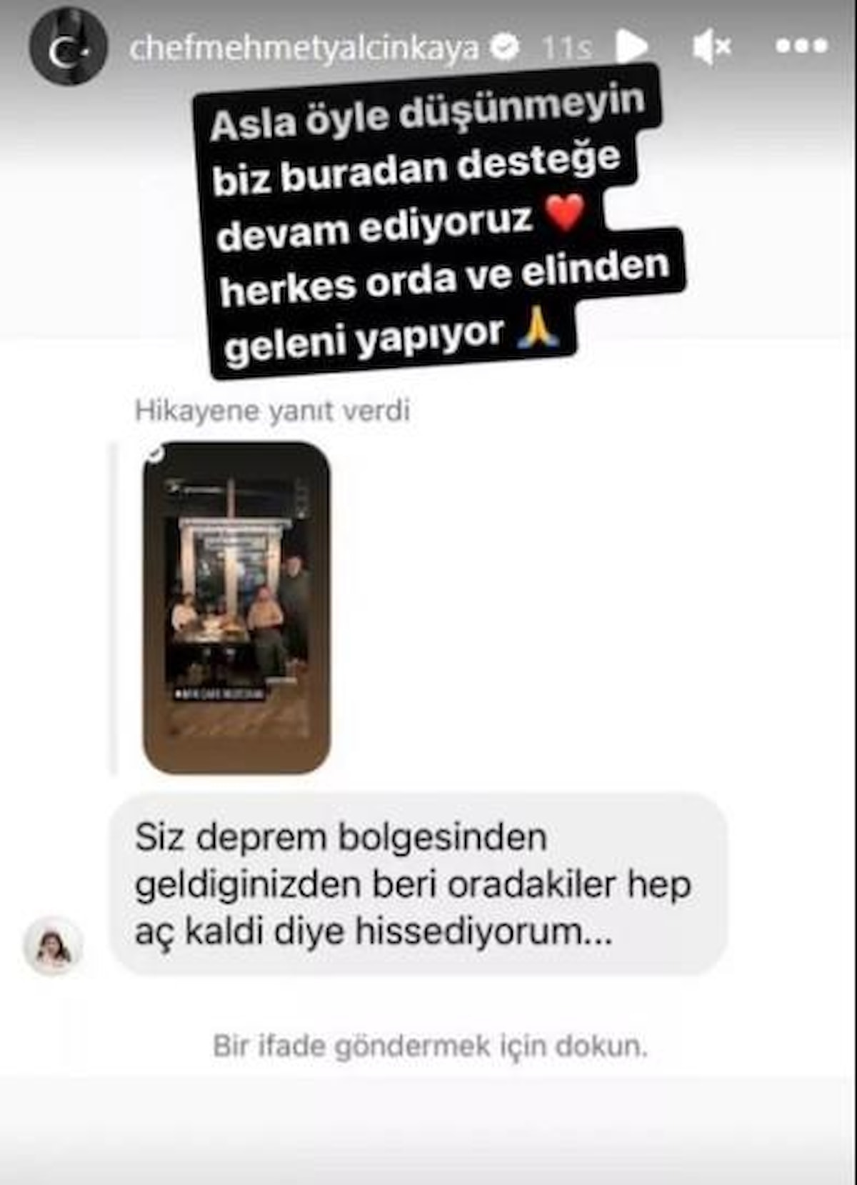 Takipçi, mesajında "Siz deprem bölgesinden geldiğinizden beri oradakiler hep aç kaldı diye hissediyorum." deyince şef "Asla öyle düşünmeyin biz buradan desteğe devam ediyoruz." dedi.