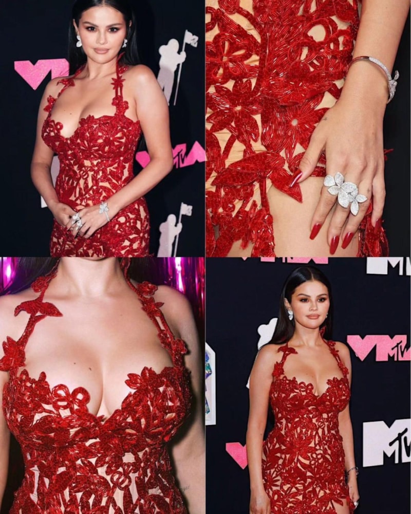 Kırmızı dantel detaylı bir elbise tercih eden Selena Gomez'in dekoltesi olay oldu.