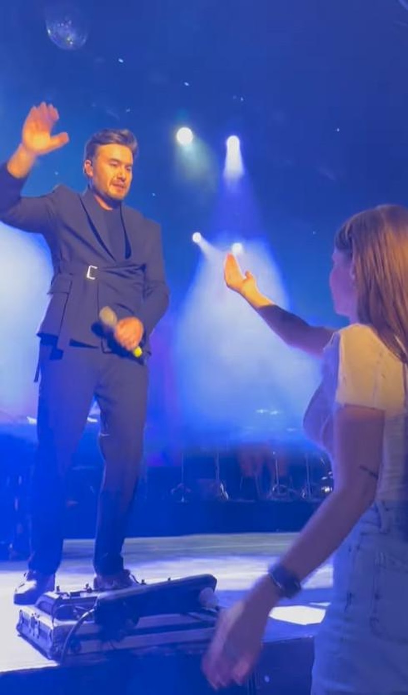 Sevenlerine unutulmaz bir akşam yaşatan Mustafa Ceceli, sahnede şarkılarını seslendirdiği sırada en öne kendisini dinlemeye gelen eşi Selin İmer tarafından uyarıldı. İmer, eşini yanına çağırarak ceketinin yırtmacını açtı.