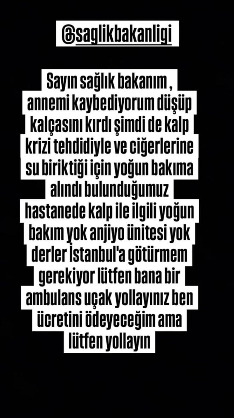 Seren Serengil, son paylaşımda; "Sayın Sağlık Bakanım, annemi kaybetme riskiyle karşı karşıyayım. Düşüp kalçasını kırdı, şimdi de kalp krizi tehdidiyle ve ciğerlerine su birikmesi nedeniyle yoğun bakıma alındı. Bulunduğumuz hastanede kalp ile ilgili yoğun bakım ve anjiyo ünitesi yok. İstanbul’a götürmem gerekiyor. Lütfen bana bir ambulans uçak gönderiniz; ücretini ödeyeceğim, ama lütfen yardım edin." ifadelerini kullandı.