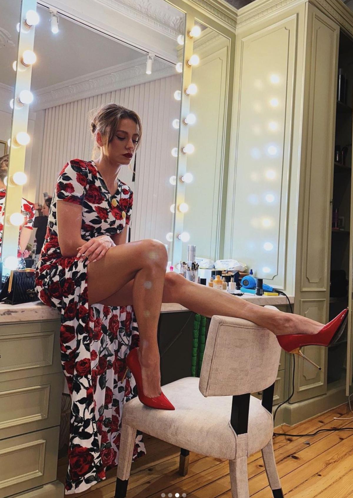 Derin bacak dekoltesi tercih eden Serenay Sarıkaya'nın makyaj masasında verdiği pozlarına beğeni yağdı.