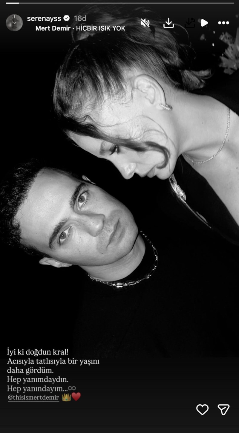 Ayrılık dedikodularının sürekli konuşulduğu çiftten yeni kare geldi. Serenay Sarıkaya, sevgilisi Mert Demir'in doğum gününü kutladı. Sevgilisiyle karesini yayınlayan Sarıkaya şunları yazdı: