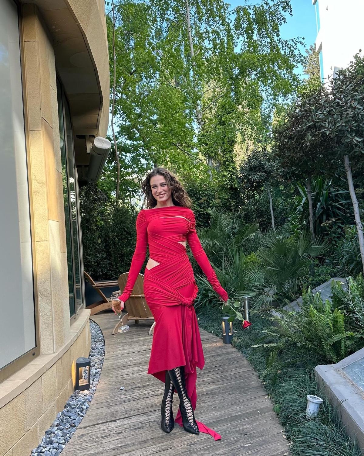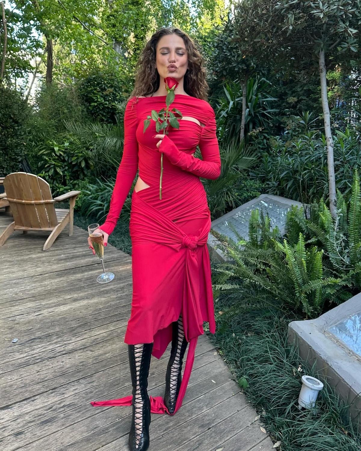 Kırmızı midi boy dekolteli elbisesi, altına giydiği bağlamalı siyah çizmeleri ile sosyal medyada gündem olan ünlü oyuncunun kombini hiç beğenilmedi.