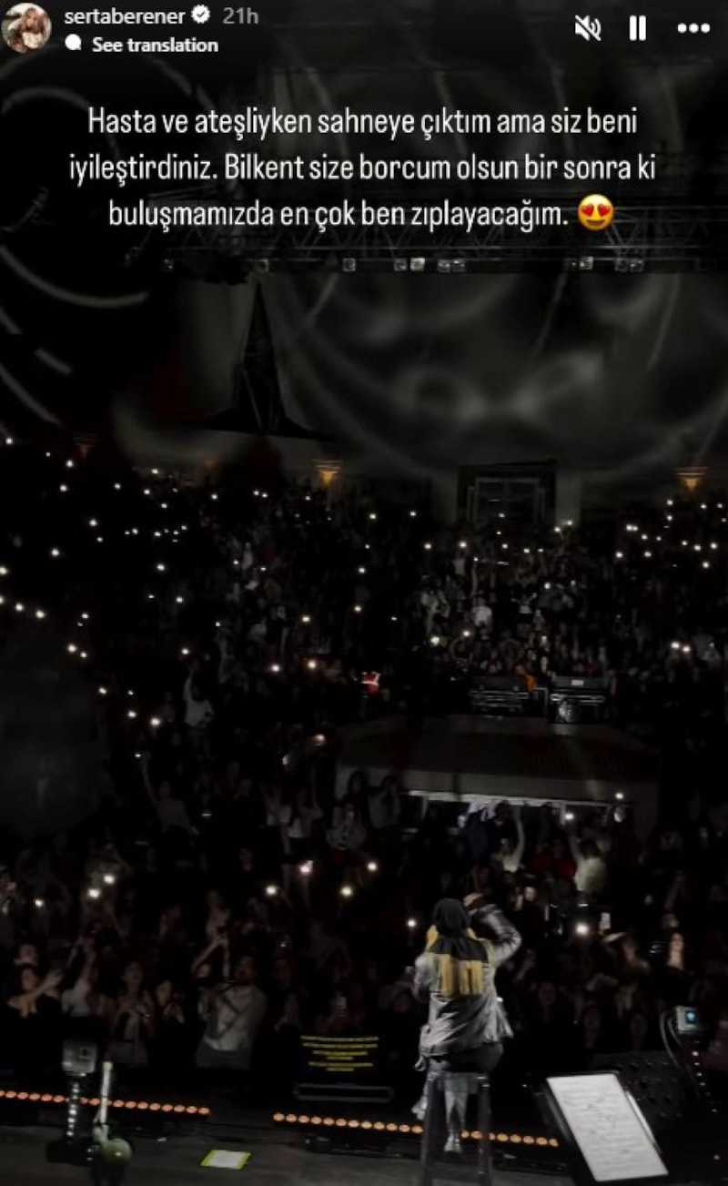 Konser sonrası Instagram hesabından duygularını paylaşan Erener, dinleyicilere teşekkür ederek, “Hastaydım, ateşim vardı ama siz beni sahnede iyileştirdiniz. Bilkent, size borcum olsun; bir dahaki gelişimde en çok ben zıplayacağım” sözleriyle dinleyicilerine mesaj gönderdi.