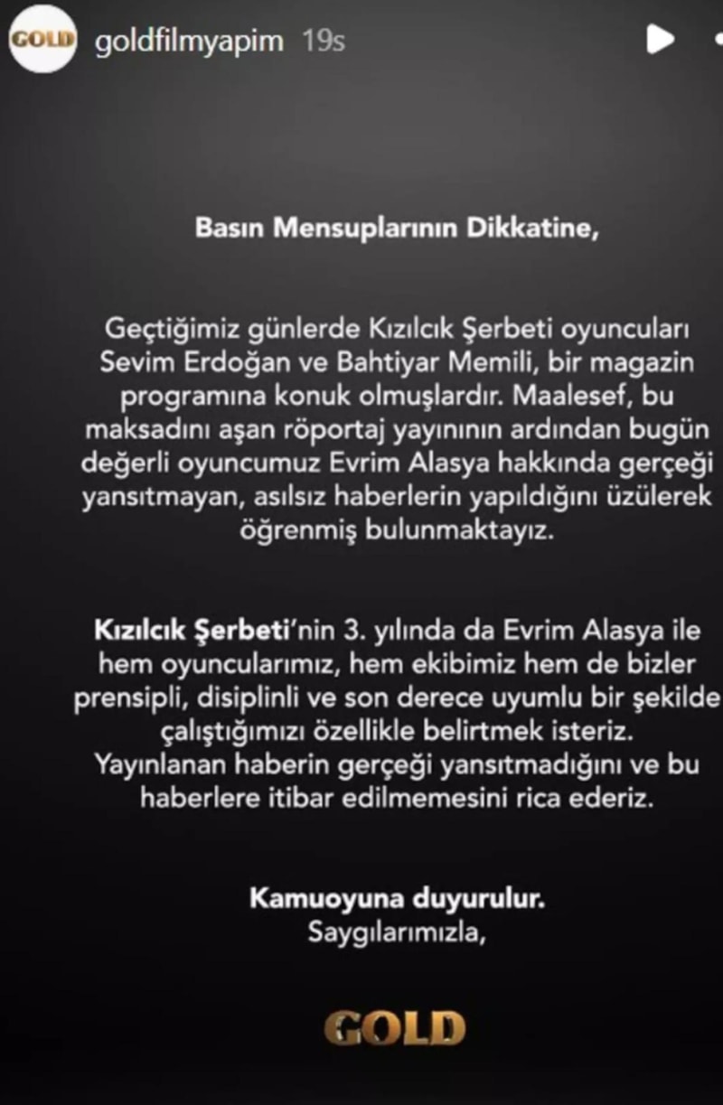 Açıklamada da 'Geçtiğimiz günlerde Kızılcık Şerbeti oyuncuları Sevim Erdoğan ve Bahtiyar Memili, Gold Film’in onayı ve bilgisi olmadan bir magazin programına konuk olmuşlardır. Maalesef bu maksadını aşan röportaj yayınının ardından bugün değerli oyuncumuz Evrim Alasya hakkında gerçeği yansıtmayan, asılsız haberlerin yapıldığını üzülerek öğrenmiş bulunmaktayız. Kızılcık Şerbeti’nin 3.yılında da Evrim Alasya ile hem oyuncularımız hem ekibimiz hem de bizler prensipli, disiplinli ve son derece uyumlu bir şekilde çalıştığımızı özellikle belirtmek isteriz.. Yayınlanan haberin gerçeği yansıtmadığını ve bu haberlere itibar edilmemesini rica ederiz.. Kamuoyuna duyurulur.. Saygılarımızla, GOLD FİLM…” ifadeleri yer aldı.