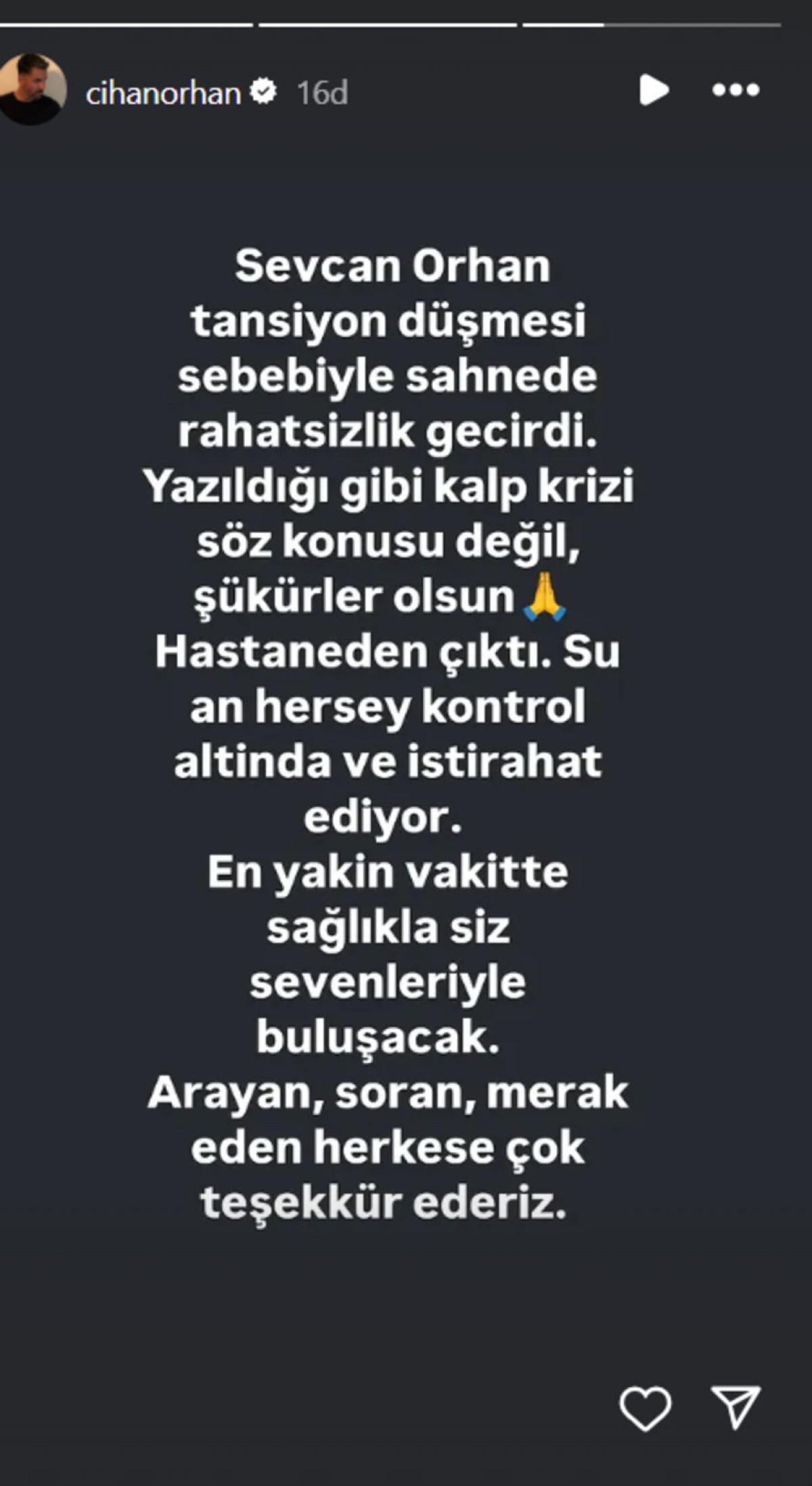 Orhan, "Sevcan Orhan, tansiyon düşmesi nedeniyle sahnede rahatsızlık geçirdi. Yazıldığı gibi kalp krizi söz konusu değildir. Şükürler olsun hastaneden çıktı. Şu an her şey kontrol altında ve istirahat ediyor. En yakın zamanda sağlıkla sevenleriyle buluşacak. Arayan, soran ve merak eden herkese çok teşekkür ederiz." dedi.
