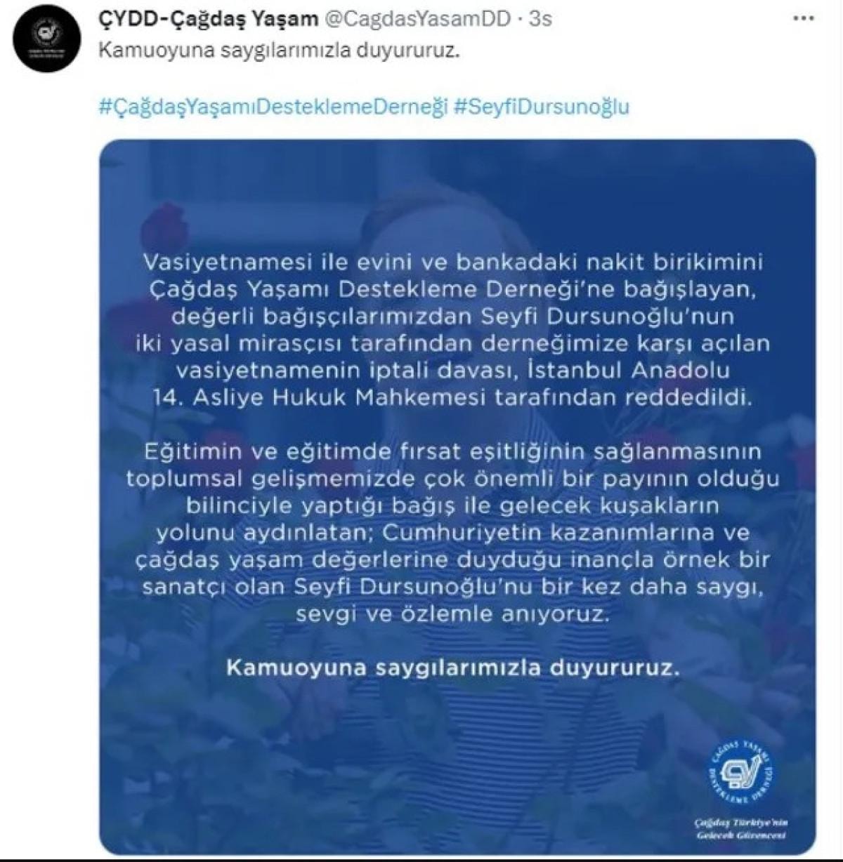 Kararın ardından sosyal medya hesabından bir açıklama yapan Çağdaş Yaşamı Destekleme Derneği, şu ifadeler kullanıldı: "Eğitimim ve eğitimde fırsat eşitliğinin sağlanmasının toplumsal gelişmemizde çok önemli payının olduğu bilinciyle yaptığı bağış ile gelecek kuşakların yolunu aydınlatan, Cumhuriyet'in kazanımlarına ve çağdaş yaşam değerlerine duyduğu inançla örnek bir sanatçı olan Seyfi Dursunoğlu'nu bir kez daha sevgi ve özlemle anıyoruz."